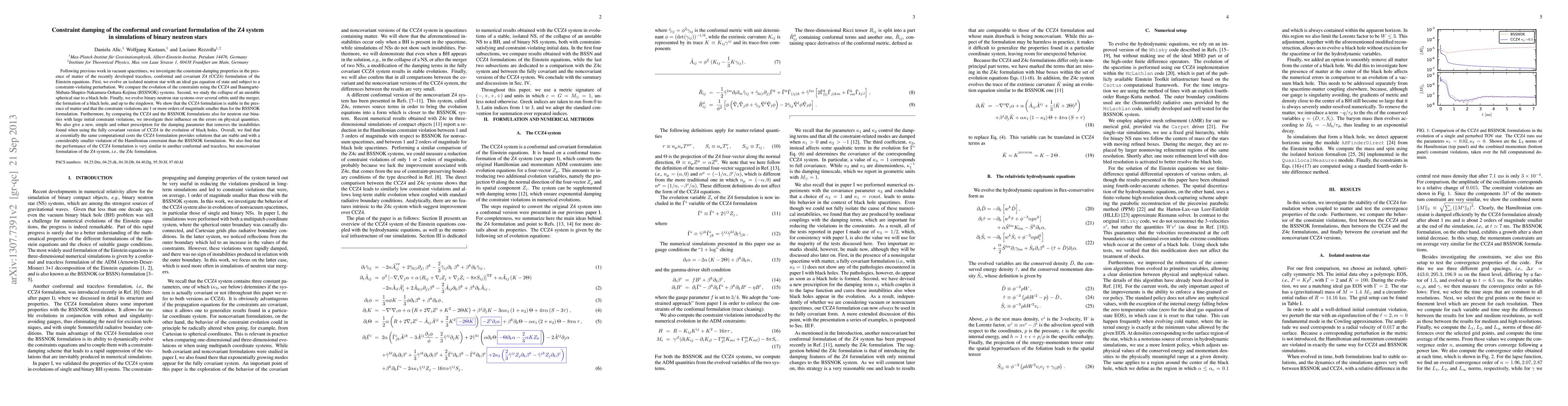 This paper investigates the stability and constraint-damping properties of the CCZ4 formulation in simulations of neutron stars and binary neutron star mergers, demonstrating its stability and significantly lower constraint violations compared to the BSSNOK formulation. It also introduces a new damping parameter prescription to resolve instabilities in the fully covariant version of CCZ4.