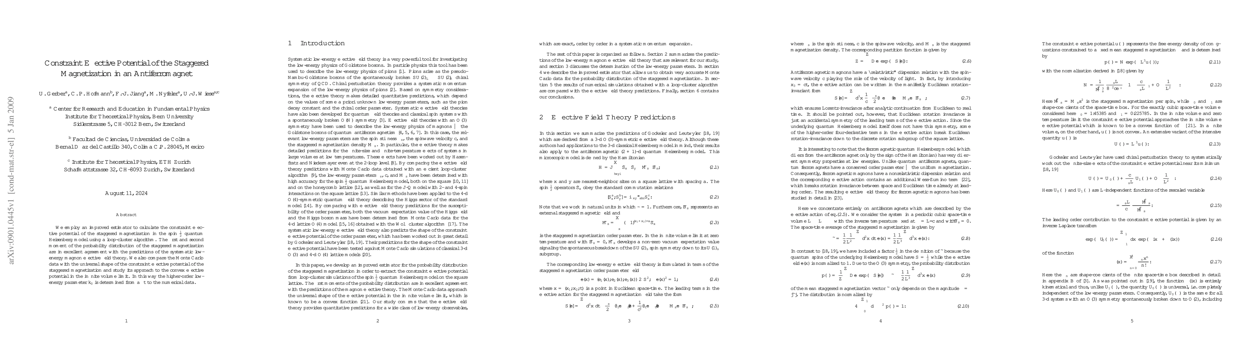 We employ an improved estimator to calculate the constraint effective potential of the staggered magnetization in the spin $\tfrac{1}{2}$ quantum Heisenberg model using a loop-cluster algorithm. The first and second moment of the probability distribution of the staggered magnetization are in excellent agreement with the predictions of the systematic low-energy magnon effective field theory. We also compare the Monte Carlo data with the universal shape of the constraint effective potential of the staggered magnetization and study its approach to the convex effective potential in the infinite volume limit. In this way the higher-order low-energy parameter $k_0$ is determined from a fit to the numerical data.