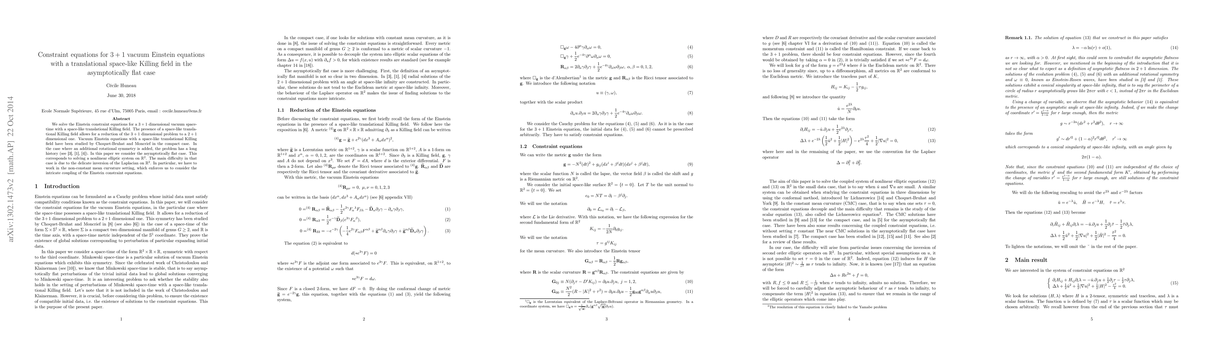 This paper solves the constraint equations for vacuum Einstein equations in an asymptotically flat space-time featuring a translational space-like Killing field, addressing the nonlinear elliptic system on R2 and the challenge of inverting the Laplacian in this context.
