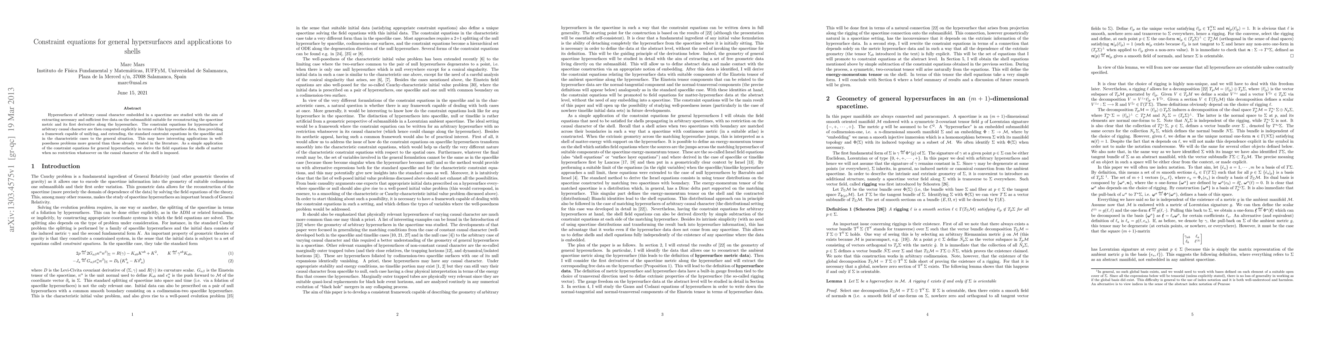 Hypersurfaces of arbitrary causal character embedded in a spacetime are studied with the aim of extracting necessary and sufficient free data on the submanifold suitable for reconstructing the spacetime metric and its first derivative along the hypersurface. The constraint equations for hypersurfaces of arbitrary causal character are then computed explicitly in terms of this hypersurface data, thus providing a framework capable of unifying, and extending, the standard constraint equations in the spacelike and in the characteristic cases to the general situation. This may have interesting applications in well-posedness problems more general than those already treated in the literature. As a simple application of the constraint equations for general hypersurfaces, we derive the field equations for shells of matter when no restriction whatsoever on the causal character of the shell is imposed.