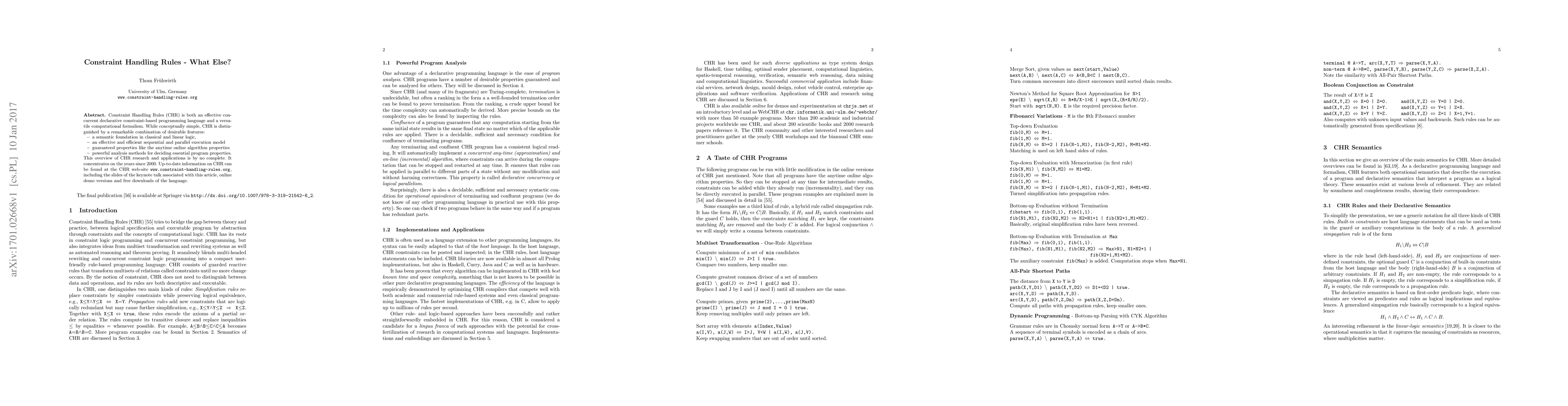 Constraint Handling Rules (CHR) is a concurrent declarative constraint-based programming language with a strong foundation in logic, offering efficient execution and powerful analysis methods. This overview focuses on CHR advancements since 2000, with further details available on the CHR website.