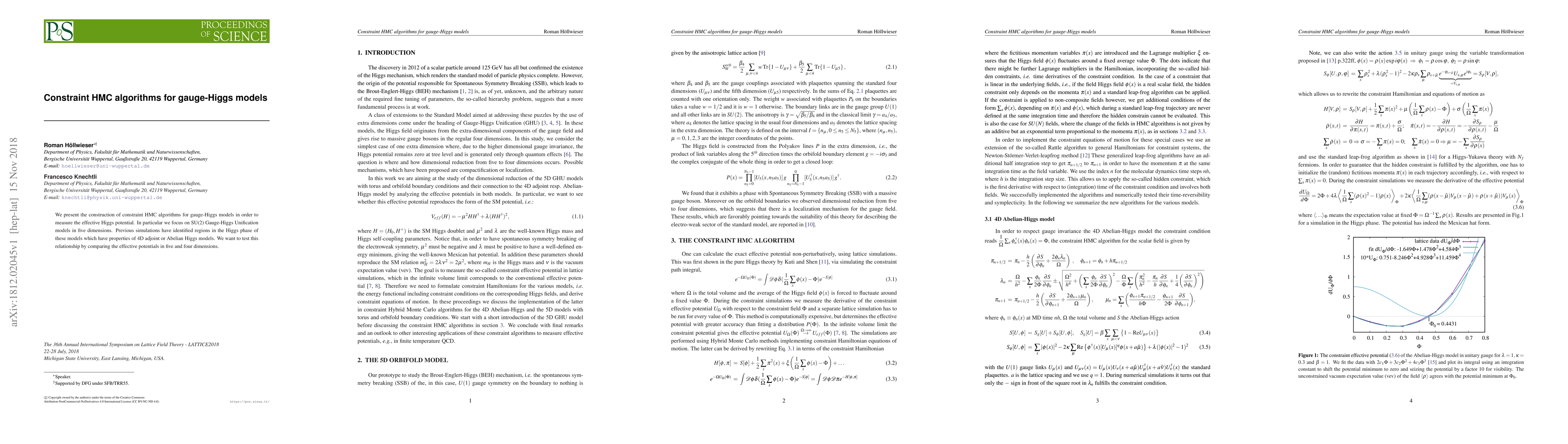 We present the construction of constraint HMC algorithms for gauge-Higgs models in order to measure the effective Higgs potential. In particular we focus on SU(2) Gauge-Higgs Unification models in five dimensions. Previous simulations have identified regions in the Higgs phase of these models which have properties of 4D adjoint or Abelian Higgs models. We want to test this relationship by comparing the effective potentials in five and four dimensions.