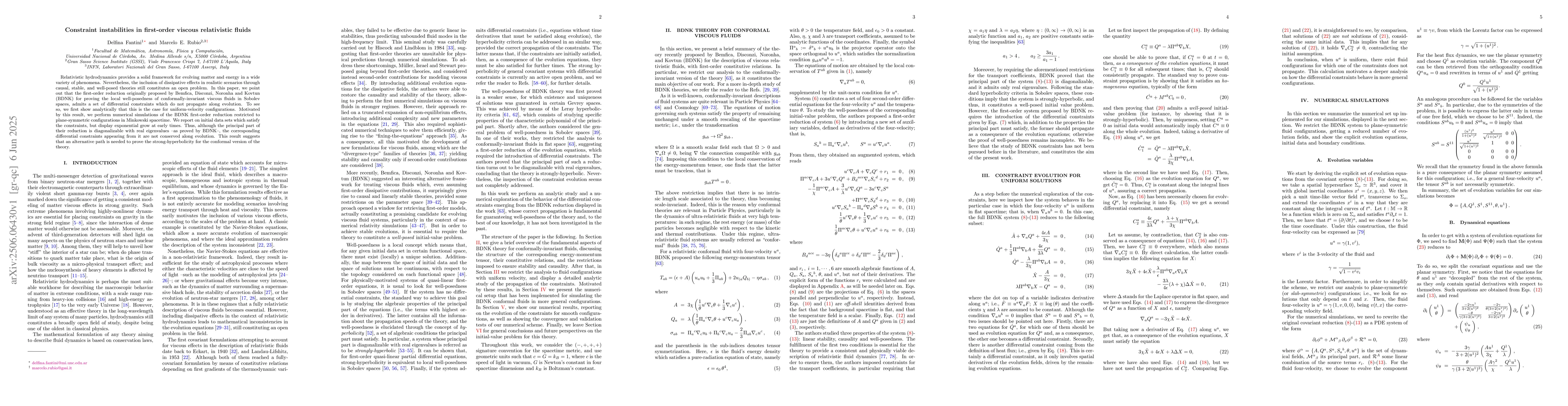 Relativistic hydrodynamics provides a solid framework for evolving matter and energy in a wide variety of phenomena. Nevertheless, the inclusion of dissipative effects in realistic scenarios through causal, stable, and well-posed theories still constitutes an open problem. In this paper, we point out that the first-order reduction originally proposed by Bemfica, Disconzi, Noronha and Kovtun (BDNK) for proving the local well-posedness of conformally-invariant viscous fluids in Sobolev spaces, admits a set of differential constraints which do not propagate along evolution. To see so, we first show analytically that this is the case for uniform-velocity configurations. Motivated by this result, we perform numerical simulations of the BDNK first-order reduction restricted to plane-symmetric configurations in Minkowski spacetime. We report on initial data sets which satisfy the constraints, but display exponential grow at early times. Thus, although the principal part of the reduction is diagonalizable with real eigenvalues --as proved by BDNK--, the corresponding differential constraints appearing from it are not conserved along evolution. This result suggests that an alternative path is needed to prove the strong-hyperbolicity for the conformal version of the theory.