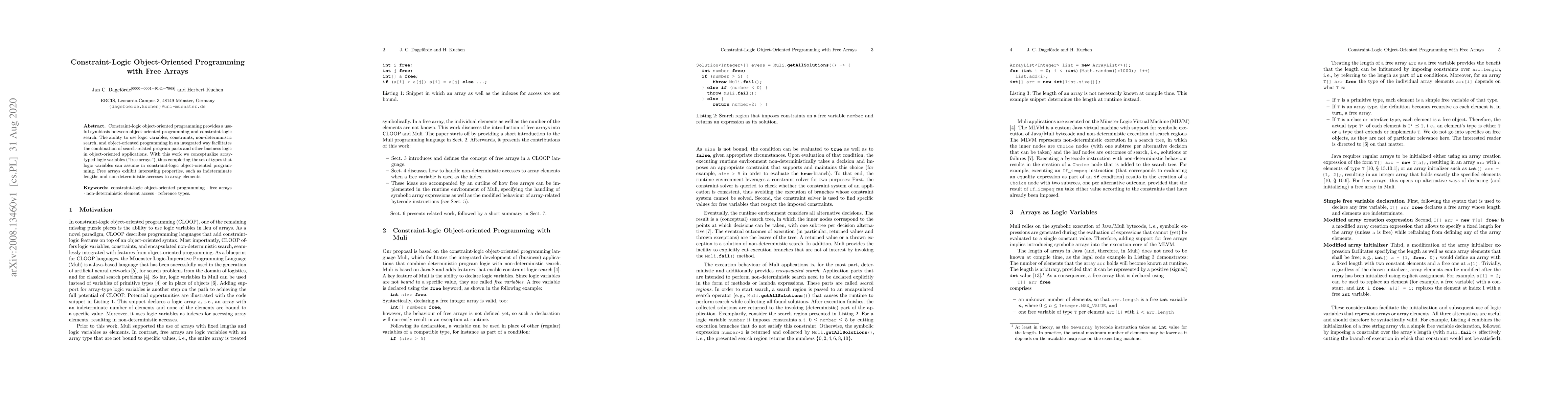 This paper introduces "free arrays" in constraint-logic object-oriented programming, integrating array-typed logic variables to complete the set of types. Free arrays allow indeterminate lengths and non-deterministic access, enhancing the combination of search-related and business logic in applications.