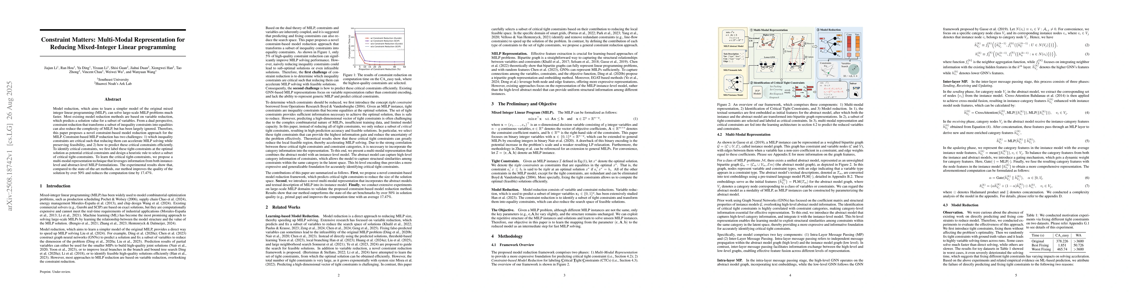 Model reduction, which aims to learn a simpler model of the original mixed integer linear programming (MILP), can solve large-scale MILP problems much faster. Most existing model reduction methods are based on variable reduction, which predicts a solution value for a subset of variables. From a dual perspective, constraint reduction that transforms a subset of inequality constraints into equalities can also reduce the complexity of MILP, but has been largely ignored. Therefore, this paper proposes a novel constraint-based model reduction approach for the MILP. Constraint-based MILP reduction has two challenges: 1) which inequality constraints are critical such that reducing them can accelerate MILP solving while preserving feasibility, and 2) how to predict these critical constraints efficiently. To identify critical constraints, we first label these tight-constraints at the optimal solution as potential critical constraints and design a heuristic rule to select a subset of critical tight-constraints. To learn the critical tight-constraints, we propose a multi-modal representation technique that leverages information from both instance-level and abstract-level MILP formulations. The experimental results show that, compared to the state-of-the-art methods, our method improves the quality of the solution by over 50\% and reduces the computation time by 17.47\%.