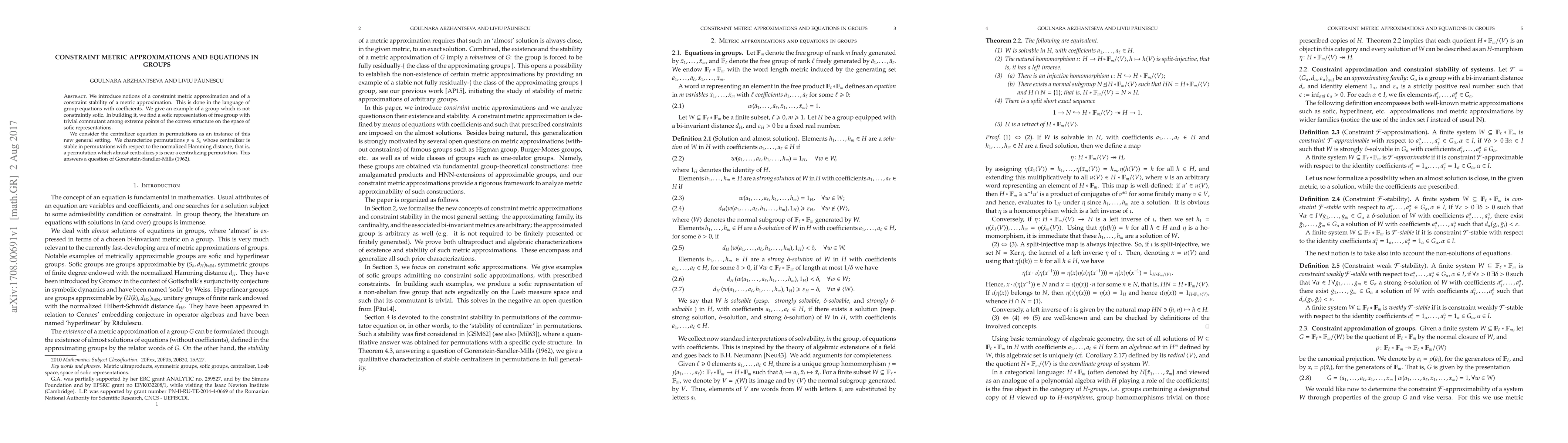 We introduce notions of a constraint metric approximation and of a constraint stability of a metric approximation. This is done in the language of group equations with coefficients. We give an example of a group which is not constraintly sofic. In building it, we find a sofic representation of free group with trivial commutant among extreme points of the convex structure on the space of sofic representations. We consider the centralizer equation in permutations as an instance of this new general setting. We characterize permutations $p\in S_k$ whose centralizer is stable in permutations with respect to the normalized Hamming distance, that is, a permutation which almost centralizes $p$ is near a centralizing permutation. This answers a question of Gorenstein-Sandler-Mills (1962).