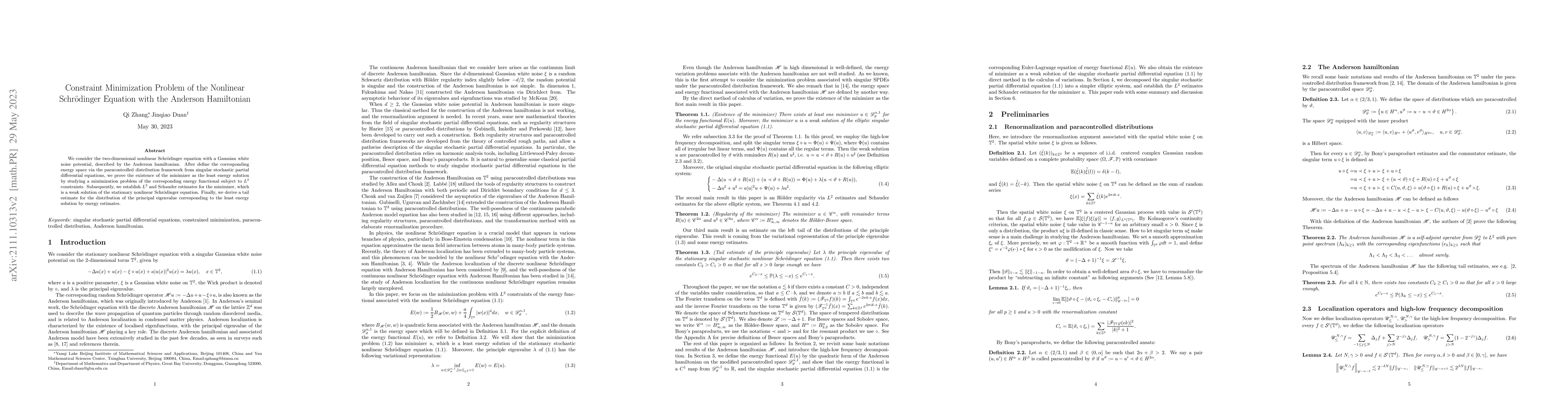 This paper explores the existence and regularity of a minimizer for the energy functional of the two-dimensional nonlinear Schrödinger equation with a white noise potential, proving its existence via the paracontrolled distribution framework. It also derives a tail estimate for the principal eigenvalue of the least energy solution using energy estimates.