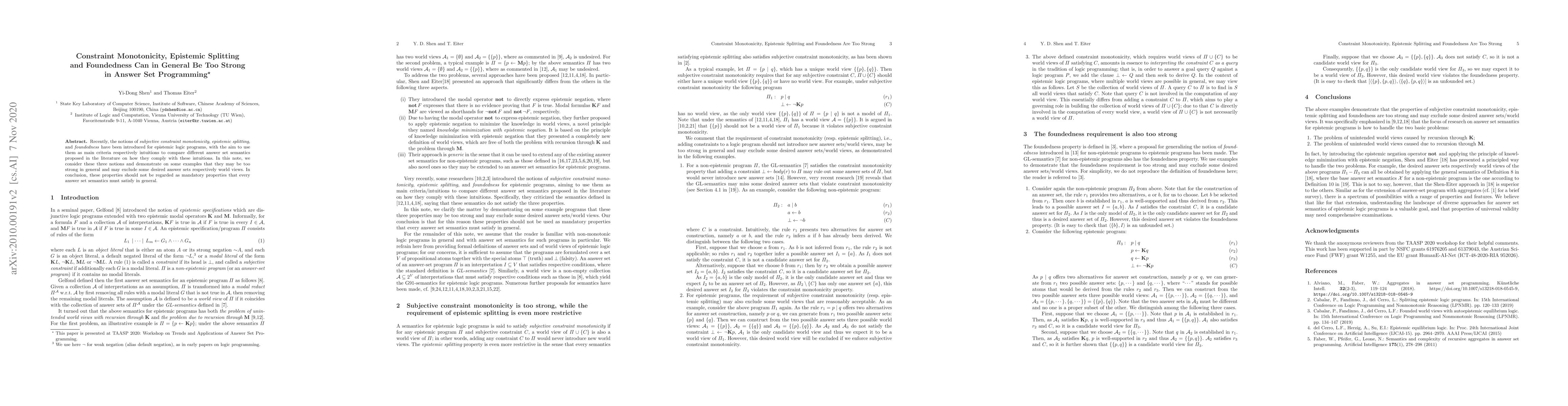 New research challenges the strength of constraint monotonicity, epistemic splitting, and foundedness in answer set programming, suggesting they may not always ensure desired world views or answer sets.