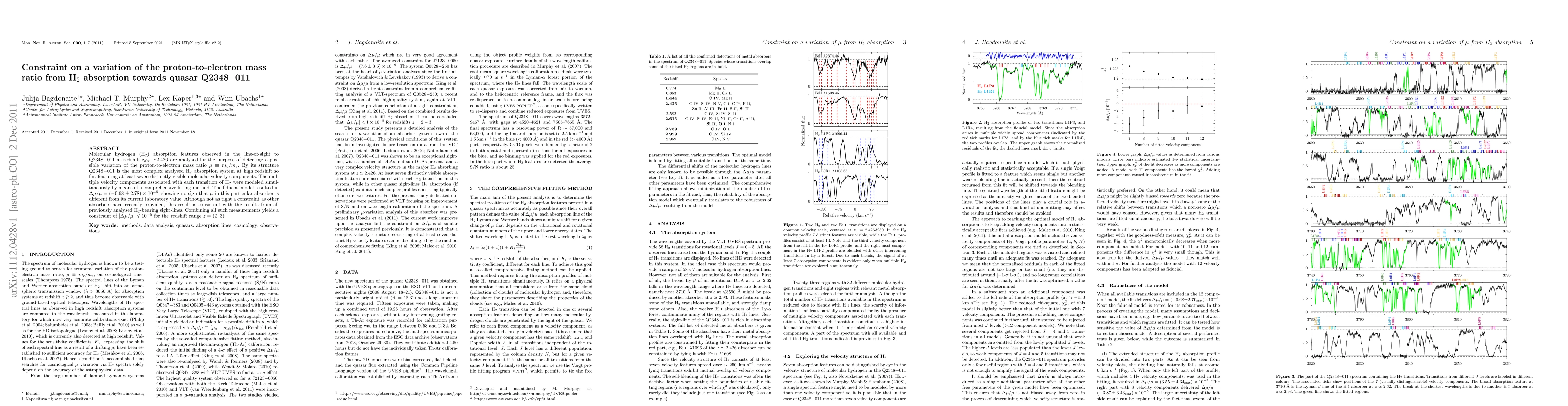 This study examines H2 absorption in a quasar's light to test for variations in the proton-to-electron mass ratio, finding no evidence of such variation within a certain redshift range.