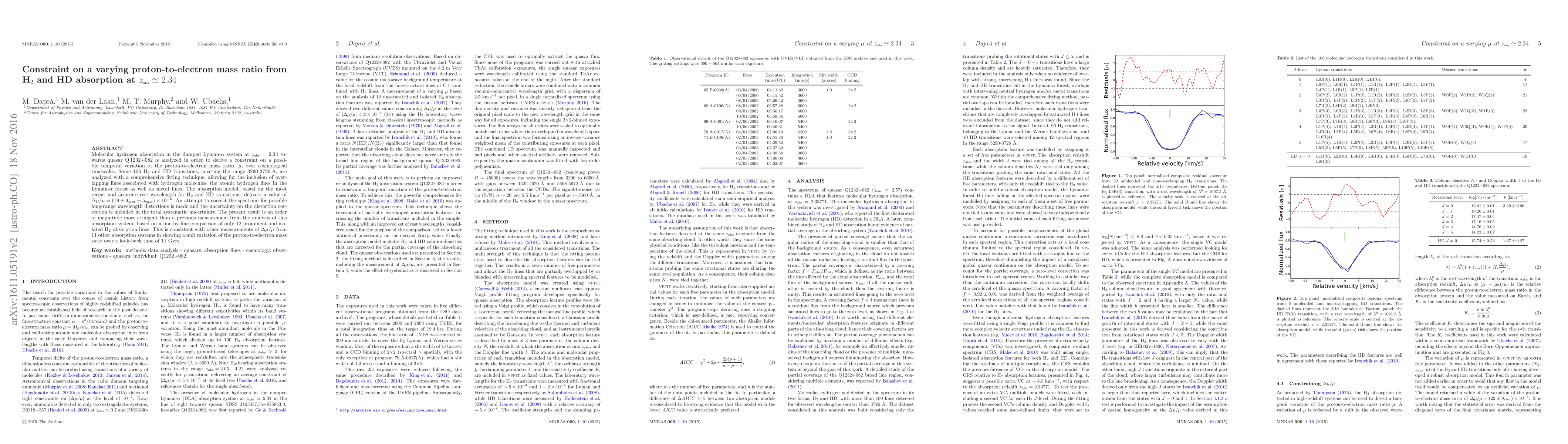 Researchers analyze H2 and HD absorption in a quasar's light to constrain the variation of proton-to-electron mass ratio over cosmological timescales, finding no significant change.
