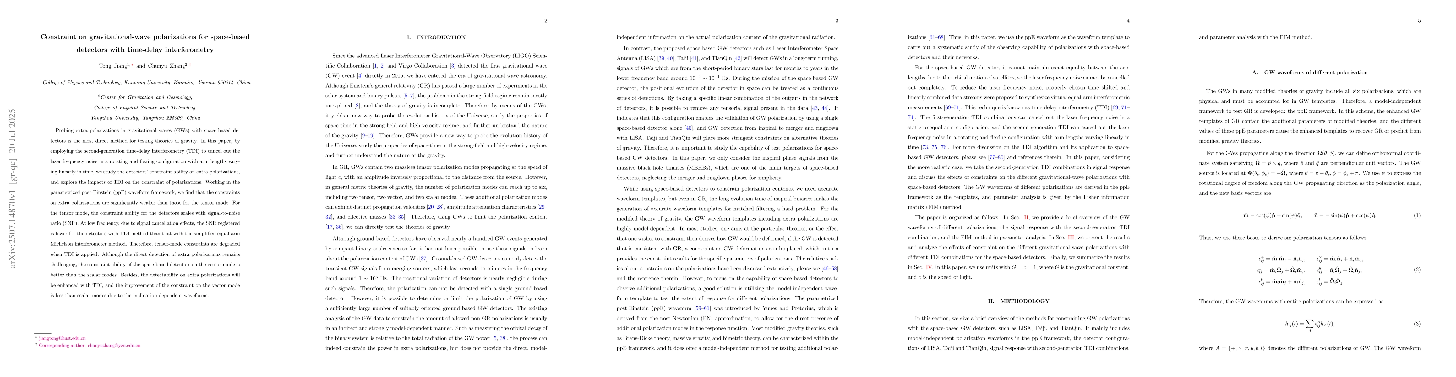 Probing extra polarizations in gravitational waves (GWs) with space-based detectors is the most direct method for testing theories of gravity. In this paper, by employing the second-generation time-delay interferometry (TDI) to cancel out the laser frequency noise in a rotating and flexing configuration with arm lengths varying linearly in time, we study the detectors' constraint ability on extra polarizations, and explore the impacts of TDI on the constraint of polarizations. Working in the parametrized post-Einstein (ppE) waveform framework, we find that the constraints on extra polarizations are significantly weaker than those for the tensor mode. For the tensor mode, the constraint ability for the detectors scales with signal-to-noise ratio (SNR). At low frequency, due to signal cancellation effects, the SNR registered is lower for the detectors with TDI method than that with the simplified equal-arm Michelson interferometer method. Therefore, tensor-mode constraints are degraded when TDI is applied. Although the direct detection of extra polarizations remains challenging, the constraint ability of the space-based detectors on the vector mode is better than the scalar modes. Besides, the detectability on extra polarizations will be enhanced with TDI, and the improvement of the constraint on the vector mode is less than scalar modes due to the inclination-dependent waveforms.