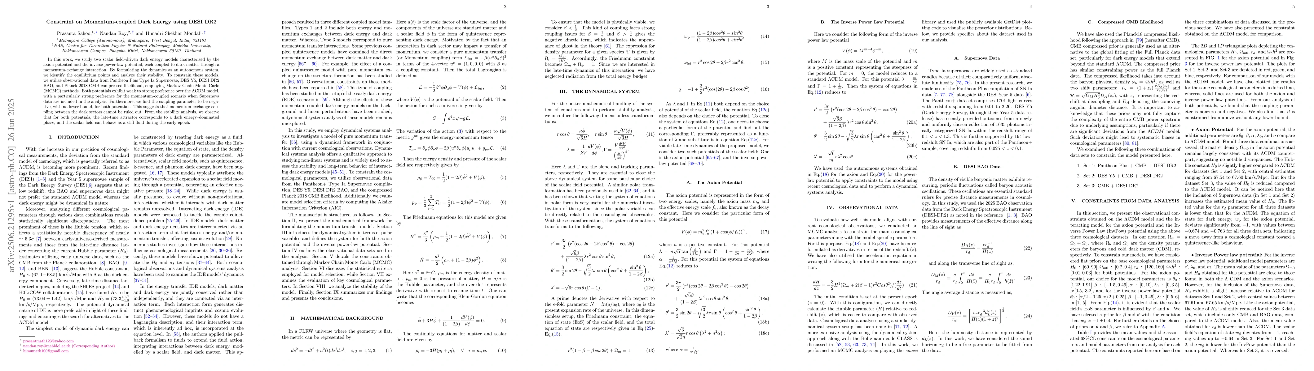 This study examines dark energy models with momentum-coupled dark matter using DESI DR2 data. Both axion and inverse power law potentials show preference for dark energy over the $Lambda$CDM model, especially with Supernova data. The analysis, using MCMC methods, indicates a negative coupling parameter without lower bound, suggesting momentum exchange between dark sectors is plausible.