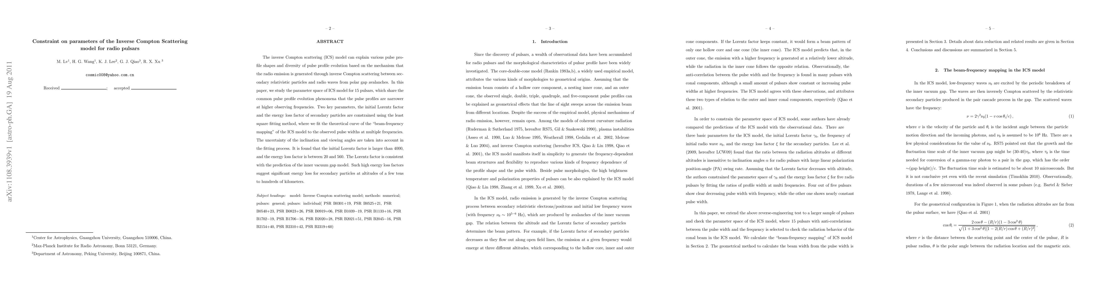 The inverse Compton scattering (ICS) model can explain various pulse profile shapes and diversity of pulse profile evolution based on the mechanism that the radio emission is generated through inverse Compton scattering between secondary relativistic particles and radio waves from polar gap avalanches. In this paper, we study the parameter space of ICS model for 15 pulsars, which share the common pulse profile evolution phenomena that the pulse profiles are narrower at higher observing frequencies. Two key parameters, the initial Lorentz factor and the energy loss factor of secondary particles are constrained using the least square fitting method, where we fit the theoretical curve of the "beam-frequency mapping" of the ICS model to the observed pulse widths at multiple frequencies. The uncertainty of the inclination and viewing angles are taken into account in the fitting process. It is found that the initial Lorentz factor is larger than 4000, and the energy loss factor is between 20 and 560. The Lorentz factor is consistent with the prediction of the inner vacuum gap model. Such high energy loss factors suggest significant energy loss for secondary particles at altitudes of a few tens to hundreds of kilometers.