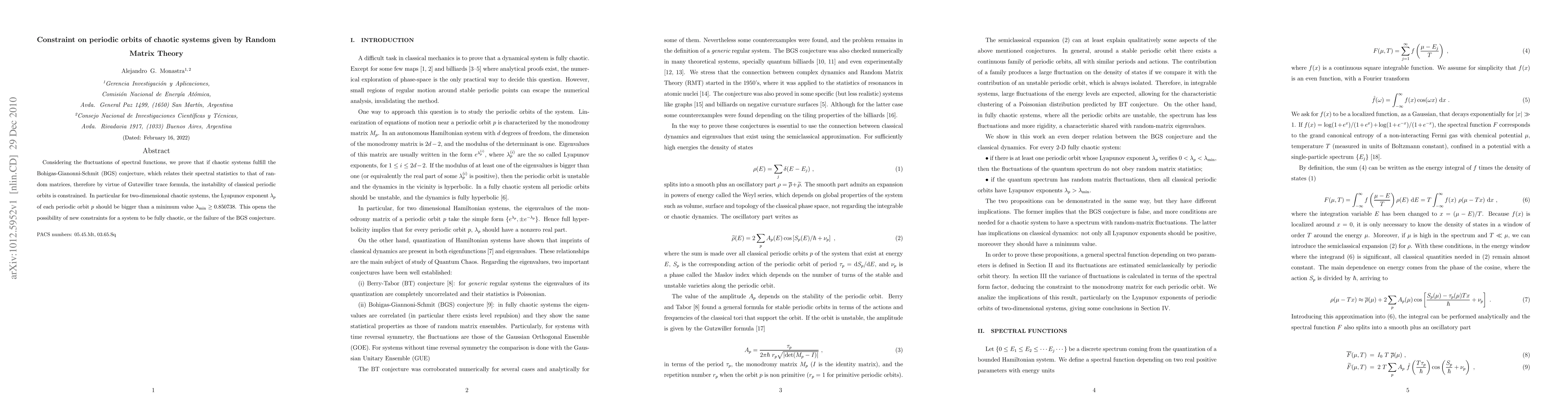 Considering the fluctuations of spectral functions, we prove that if chaotic systems fulfill the Bohigas-Gianonni-Schmit (BGS) conjecture, which relates their spectral statistics to that of random matrices, therefore by virtue of Gutzwiller trace formula, the instability of classical periodic orbits is constrained. In particular for two-dimensional chaotic systems, the Lyapunov exponent $\lambda_p$ of each periodic orbit $p$ should be bigger than a minimum value $\lambda_{\text{min}} \geq 0.850738$. This opens the possibility of new constraints for a system to be fully chaotic, or the failure of the BGS conjecture.