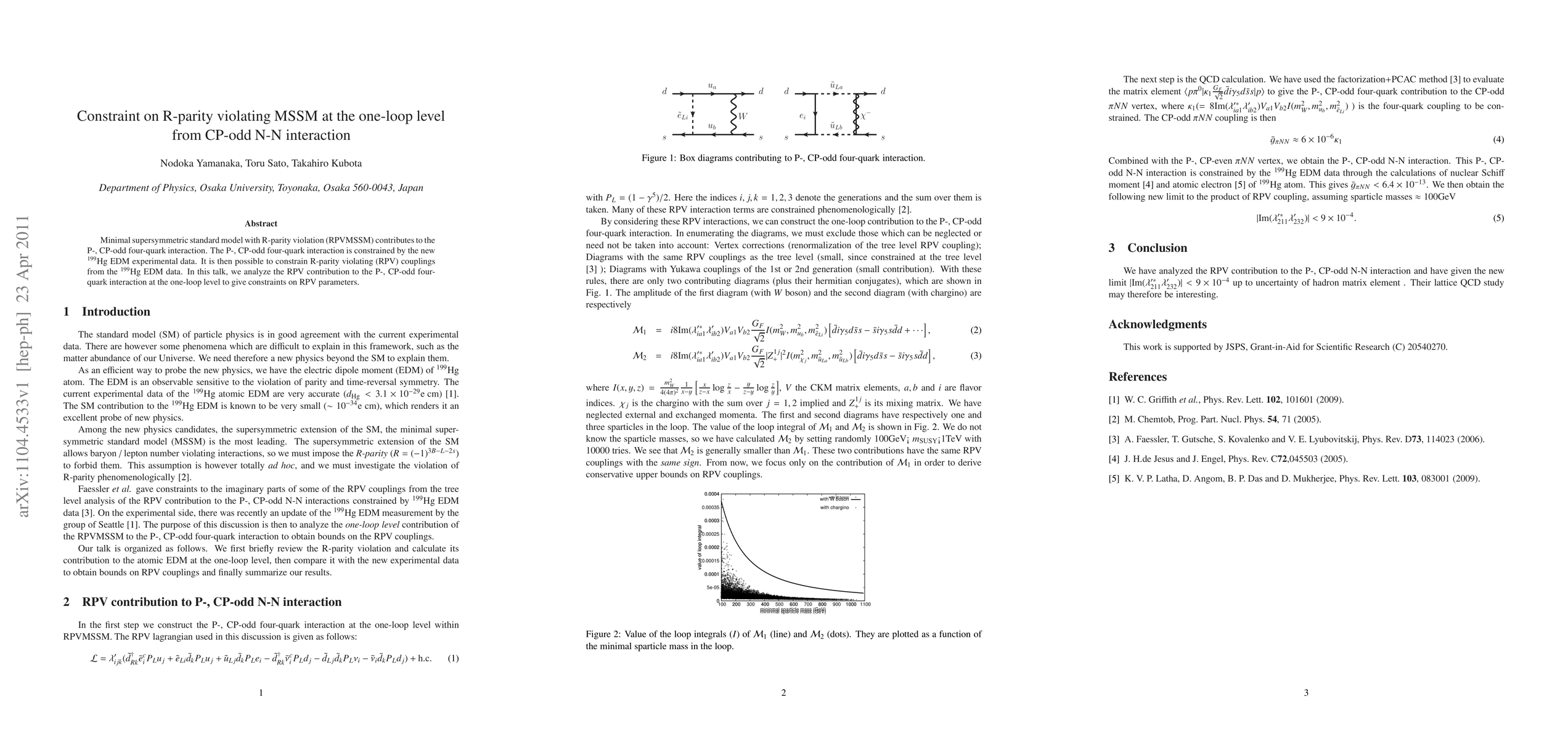This paper investigates the R-parity violating minimal supersymmetric standard model (RPVMSSM) and its contribution to CP-odd four-quark interactions. Using new experimental data from 199Hg electric dipole moment (EDM) measurements, the study constrains RPV couplings and provides one-loop level constraints on RPV parameters.