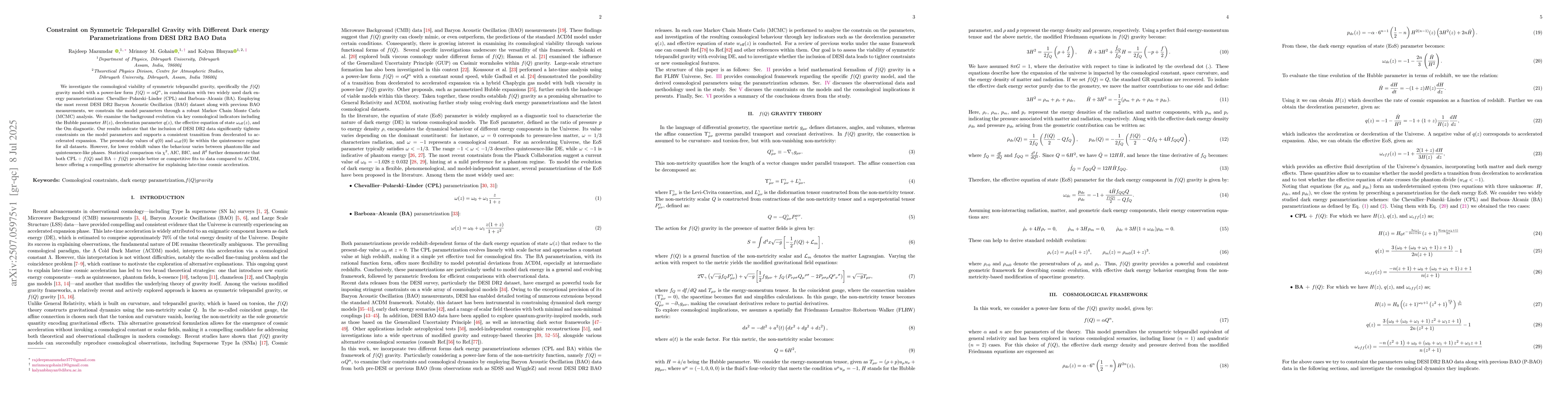 We investigate the cosmological viability of symmetric teleparallel gravity, specifically the $f(Q)$ gravity model with a power-law form $f(Q) = \alpha Q^n$, in combination with two widely used dark energy parameterizations: Chevallier Polarski Linder (CPL) and Barboza Alcaniz (BA). Employing the most recent DESI DR2 Baryon Acoustic Oscillation (BAO) dataset along with previous BAO measurements, we constrain the model parameters through a robust Markov Chain Monte Carlo (MCMC) analysis. We examine the background evolution via key cosmological indicators including the Hubble parameter $H(z)$, deceleration parameter $q(z)$, the effective equation of state $\omega_{\rm eff}(z)$, and the Om diagnostic. Our results indicate that the inclusion of DESI DR2 data significantly tightens constraints on the model parameters and supports a consistent transition from decelerated to accelerated expansion. The present-day values of $q(0)$ and $\omega_{\rm eff}(0)$ lie within the quintessence regime for all datasets. However, for lower redshift values the behaviour varies between phantom-like and quintessence-like phases. Statistical comparison via $\chi^2$, AIC, BIC, and $R^2$ further demonstrate that both CPL + $f(Q)$ and BA + $f(Q)$ provide better or competitive fits to data compared to $\Lambda$CDM, hence offering a compelling geometric alternative for explaining late-time cosmic acceleration.