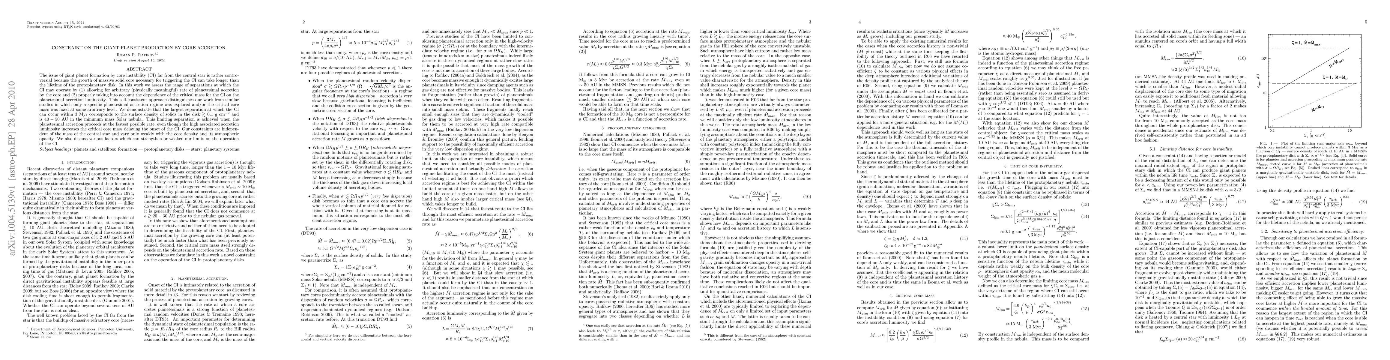 This paper assesses the conditions under which giant planet formation via core instability can occur, finding that the largest possible separation for this process within 3 Myr is 40-50 AU in a minimum mass Solar nebula, provided the disk's surface density of solids exceeds 0.1 g cm^{-2}. The study's self-consistent approach considers variable accretion rates and the critical mass's dependence on accretion luminosity.