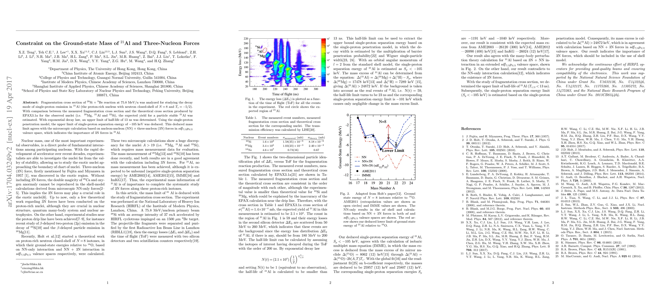 Fragmentation cross section of $^{28}$Si + $^{9}$Be reaction at 75.8 MeV/u was analyzed for studying the decay mode of single-proton emission in $^{21}$Al (the proton-rich nucleus with neutron closed-shell of $N = 8$ and $T_z = -5/2$). With the comparison between the measured fragmentation cross section and the theoretical cross section produced by EPAX3.1a for the observed nuclei (i.e. $^{20}$Mg, $^{21}$Al and $^{22}$Si), the expected yield for a particle stable $^{21}$Al was estimated. With the exponential decay law, an upper limit of half-life of $13$ ns was determined. Using the single-proton penetration model, the upper limit of single-proton separation energy of $-105$ keV was deduced. This deduced mass limit agrees with the microscopic calculation based on nucleon-nucleon (NN) + three-nucleon (3N) forces in $sdf_{7/2}p_{3/2}$ valence space, which indicates the importance of 3N forces in $^{21}$Al.