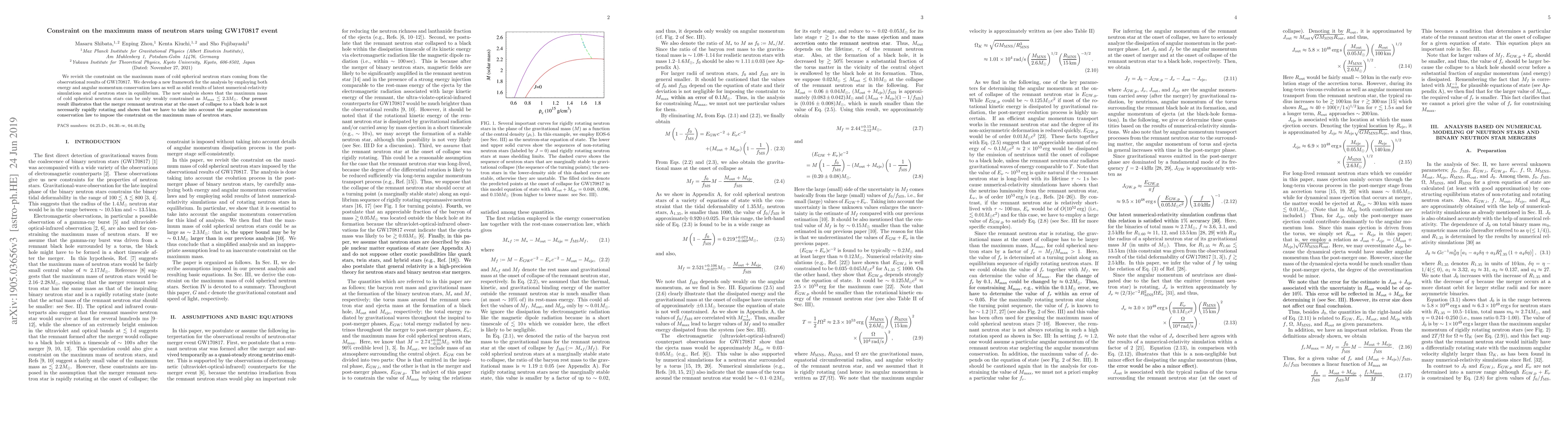 This paper revisits the maximum mass constraint for cold neutron stars using the GW170817 event, employing energy and angular momentum conservation laws alongside recent numerical simulations. The analysis concludes that the maximum mass is weakly constrained at $M_{\rm max} \alt 2.3M_\odot$, emphasizing the importance of angular momentum conservation in determining neutron star mass limits.