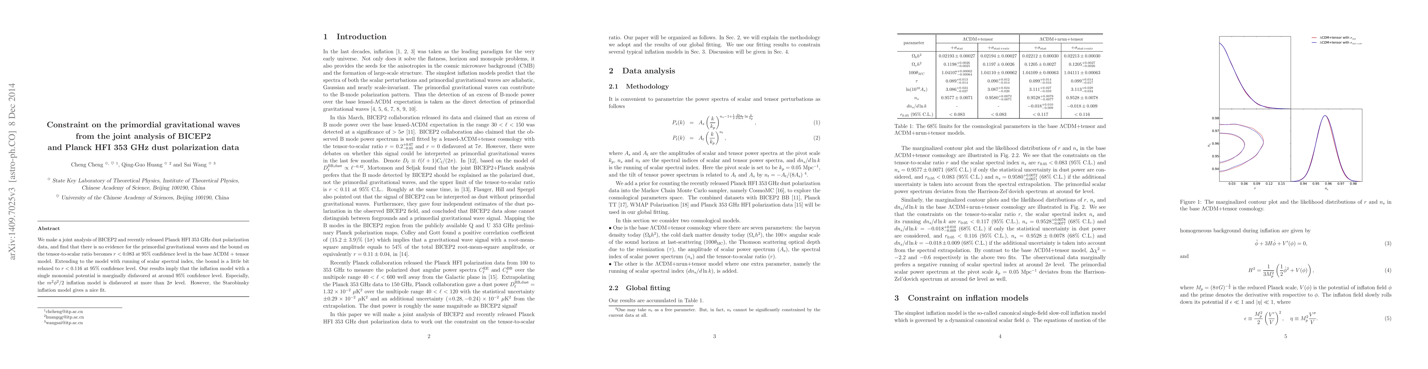 We make a joint analysis of BICEP2 and recently released Planck HFI 353 GHz dust polarization data, and find that there is no evidence for the primordial gravitational waves and the bound on the tensor-to-scalar ratio becomes $r<0.083$ at $95%$ confidence level in the base $\Lambda$CDM + tensor model. Extending to the model with running of scalar spectral index, the bound is a little bit relaxed to $r<0.116$ at $95%$ confidence level. Our results imply that the inflation model with a single monomial potential is marginally disfavored at around $95%$ confidence level. Especially, the $m^2\phi^2/2$ inflation model is disfavored at more than $2\sigma$ level. However, the Starobinsky inflation model gives a nice fit.