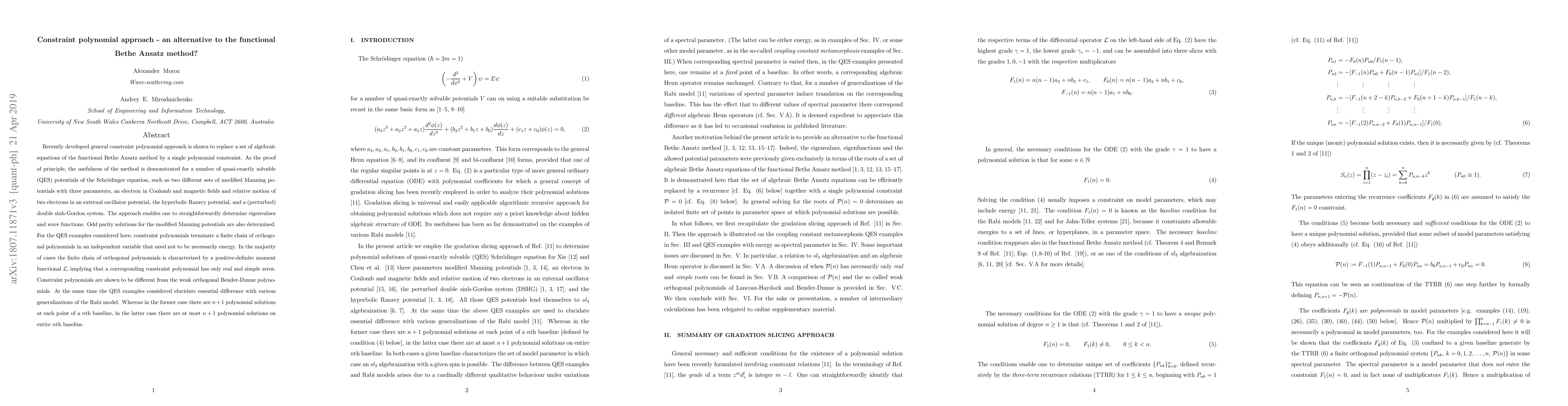 Recently developed general constraint polynomial approach is shown to replace a set of algebraic equations of the functional Bethe Ansatz method by a single polynomial constraint. As the proof of principle, the usefulness of the method is demonstrated for a number of quasi-exactly solvable (QES) potentials of the Schr\"odinger equation, such as two different sets of modified Manning potentials with three parameters, an electron in Coulomb and magnetic fields and relative motion of two electrons in an external oscillator potential, the hyperbolic Razavy potential, and a (perturbed) double sinh-Gordon system. The approach enables one to straightforwardly determine eigenvalues and wave functions. Odd parity solutions for the modified Manning potentials are also determined. For the QES examples considered here, constraint polynomials terminate a finite chain of orthogonal polynomials in an independent variable that need not to be necessarily energy. In the majority of cases the finite chain of orthogonal polynomials is characterized by a positive-definite moment functional ${\cal L}$, implying that a corresponding constraint polynomial has only real and simple zeros. Constraint polynomials are shown to be different from the weak orthogonal Bender-Dunne polynomials. At the same time the QES examples considered elucidate essential difference with various generalizations of the Rabi model. Whereas in the former case there are $n+1$ polynomial solutions at each point of a $n$th baseline, in the latter case there are at most $n+1$ polynomial solutions on entire $n$th baseline.