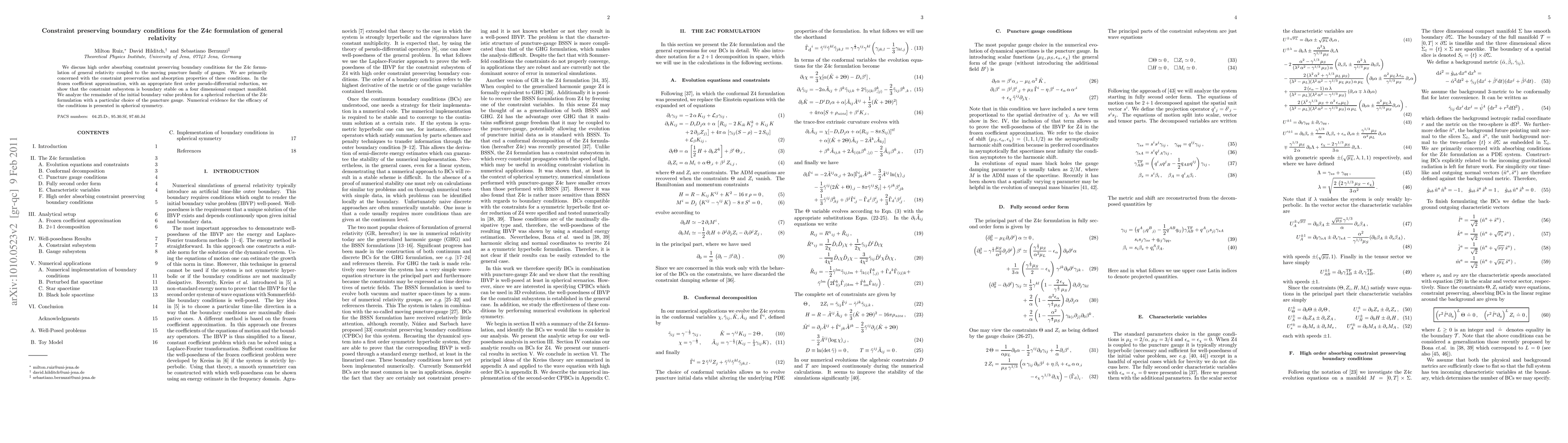 We discuss high order absorbing constraint preserving boundary conditions for the Z4c formulation of general relativity coupled to the moving puncture family of gauges. We are primarily concerned with the constraint preservation and absorption properties of these conditions. In the frozen coefficient approximation, with an appropriate first order pseudo-differential reduction, we show that the constraint subsystem is boundary stable on a four dimensional compact manifold. We analyze the remainder of the initial boundary value problem for a spherical reduction of the Z4c formulation with a particular choice of the puncture gauge. Numerical evidence for the efficacy of the conditions is presented in spherical symmetry.