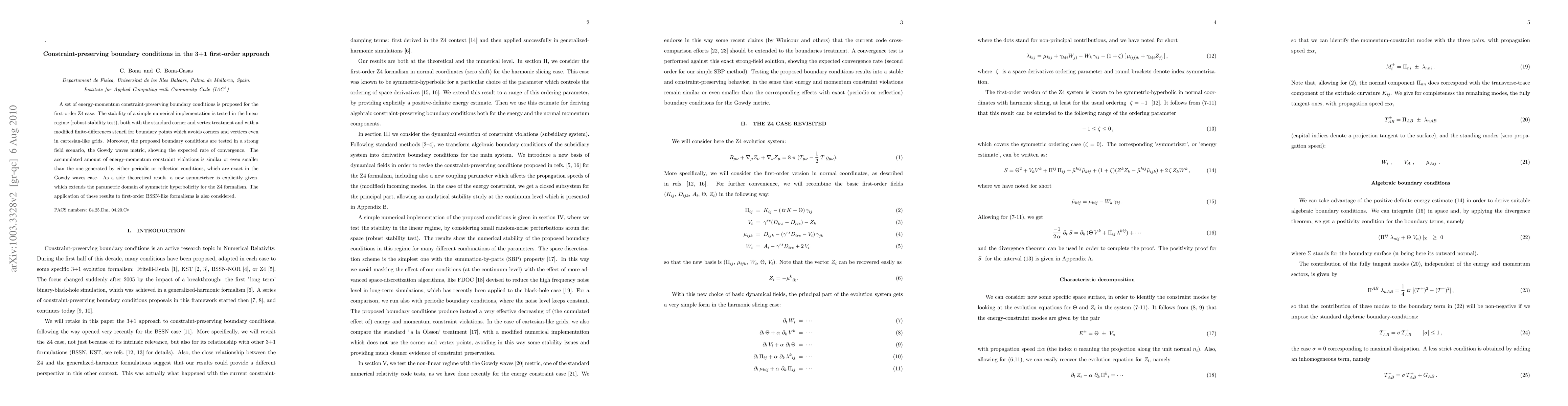 A set of energy-momentum constraint-preserving boundary conditions is proposed for the first-order Z4 case. The stability of a simple numerical implementation is tested in the linear regime (robust stability test), both with the standard corner and vertex treatment and with a modified finite-differences stencil for boundary points which avoids corners and vertices even in cartesian-like grids. Moreover, the proposed boundary conditions are tested in a strong field scenario, the Gowdy waves metric, showing the expected rate of convergence. The accumulated amount of energy-momentum constraint violations is similar or even smaller than the one generated by either periodic or reflection conditions, which are exact in the Gowdy waves case. As a side theoretical result, a new symmetrizer is explicitly given, which extends the parametric domain of symmetric hyperbolicity for the Z4 formalism. The application of these results to first-order BSSN-like formalisms is also considered.