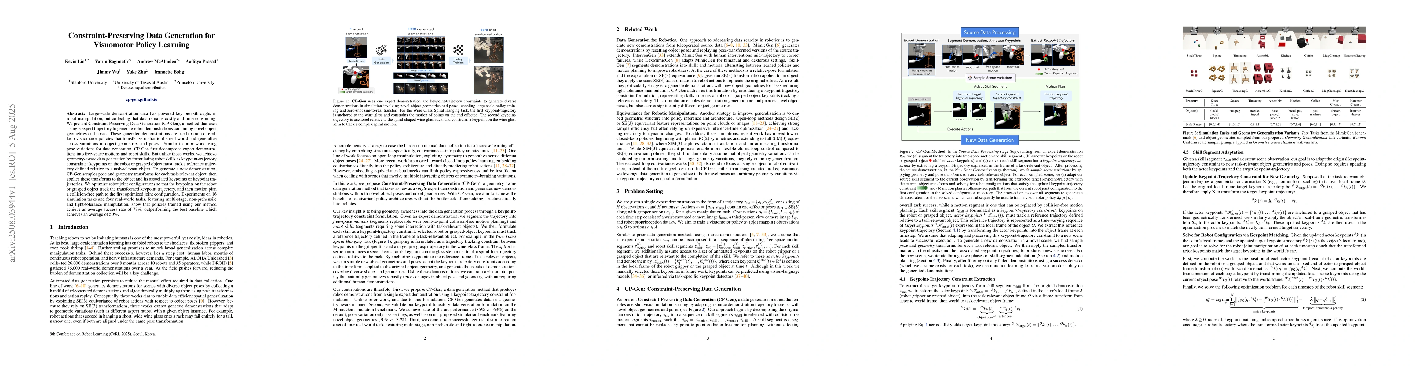 Large-scale demonstration data has powered key breakthroughs in robot manipulation, but collecting that data remains costly and time-consuming. We present Constraint-Preserving Data Generation (CP-Gen), a method that uses a single expert trajectory to generate robot demonstrations containing novel object geometries and poses. These generated demonstrations are used to train closed-loop visuomotor policies that transfer zero-shot to the real world and generalize across variations in object geometries and poses. Similar to prior work using pose variations for data generation, CP-Gen first decomposes expert demonstrations into free-space motions and robot skills. But unlike those works, we achieve geometry-aware data generation by formulating robot skills as keypoint-trajectory constraints: keypoints on the robot or grasped object must track a reference trajectory defined relative to a task-relevant object. To generate a new demonstration, CP-Gen samples pose and geometry transforms for each task-relevant object, then applies these transforms to the object and its associated keypoints or keypoint trajectories. We optimize robot joint configurations so that the keypoints on the robot or grasped object track the transformed keypoint trajectory, and then motion plan a collision-free path to the first optimized joint configuration. Experiments on 16 simulation tasks and four real-world tasks, featuring multi-stage, non-prehensile and tight-tolerance manipulation, show that policies trained using CP-Gen achieve an average success rate of 77%, outperforming the best baseline that achieves an average of 50%.
