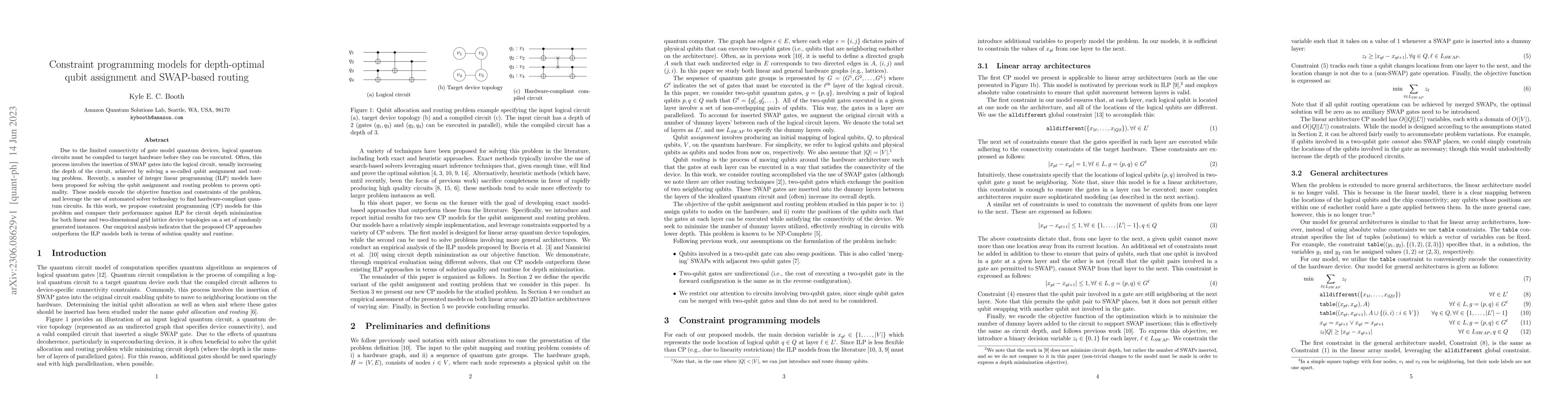 This paper proposes constraint programming models for optimizing the depth of qubit assignment and SWAP-based routing in quantum circuits. The study finds that these CP models outperform integer linear programming models in both solution quality and runtime for various device topologies.