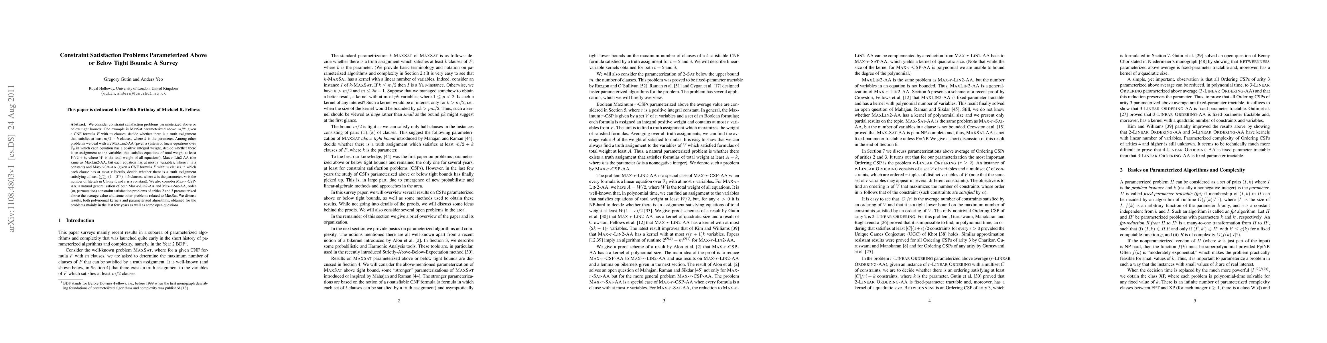 This paper surveys constraint satisfaction problems (CSPs) parameterized above or below tight bounds, focusing on problems like MaxSat, MaxLin2-AA, and Max-$r$-Lin2-AA. The authors discuss recent results on polynomial kernels and parameterized algorithms, highlighting both achievements and open questions.