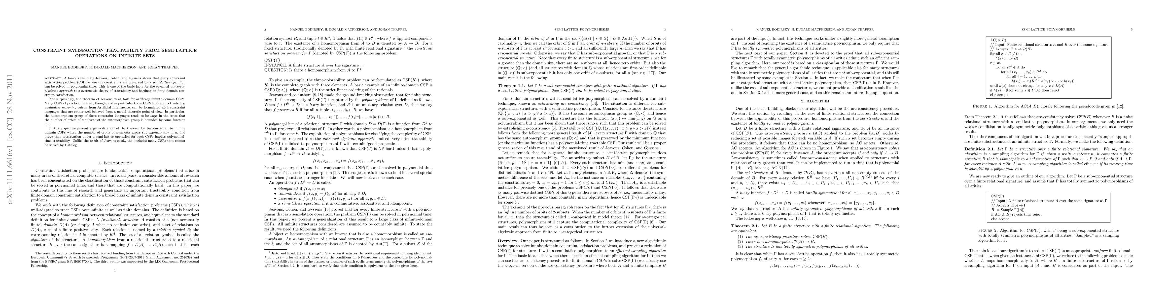 This paper generalizes a polynomial-time tractability theorem for finite constraint satisfaction problems (CSPs) to infinite CSPs, showing that if the number of orbits of n-subsets grows sub-exponentially, then CSPs preserved by semi-lattice operations are also tractable, extending beyond the scope of Datalog.