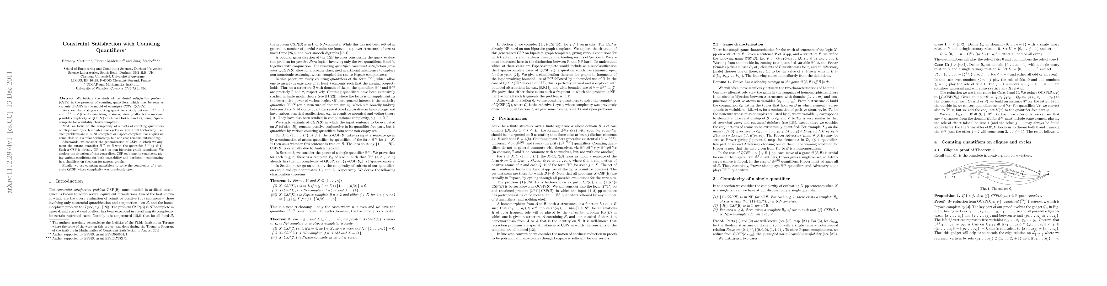 We initiate the study of constraint satisfaction problems (CSPs) in the presence of counting quantifiers, which may be seen as variants of CSPs in the mould of quantified CSPs (QCSPs). We show that a single counting quantifier strictly between exists^1:=exists and exists^n:=forall (the domain being of size n) already affords the maximal possible complexity of QCSPs (which have both exists and forall), being Pspace-complete for a suitably chosen template. Next, we focus on the complexity of subsets of counting quantifiers on clique and cycle templates. For cycles we give a full trichotomy -- all such problems are in L, NP-complete or Pspace-complete. For cliques we come close to a similar trichotomy, but one case remains outstanding. Afterwards, we consider the generalisation of CSPs in which we augment the extant quantifier exists^1:=exists with the quantifier exists^j (j not 1). Such a CSP is already NP-hard on non-bipartite graph templates. We explore the situation of this generalised CSP on bipartite templates, giving various conditions for both tractability and hardness -- culminating in a classification theorem for general graphs. Finally, we use counting quantifiers to solve the complexity of a concrete QCSP whose complexity was previously open.