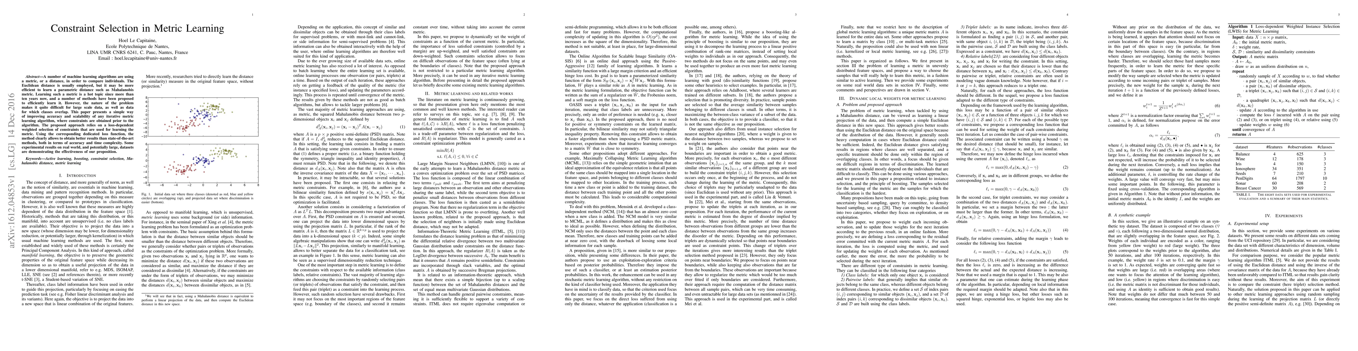 A number of machine learning algorithms are using a metric, or a distance, in order to compare individuals. The Euclidean distance is usually employed, but it may be more efficient to learn a parametric distance such as Mahalanobis metric. Learning such a metric is a hot topic since more than ten years now, and a number of methods have been proposed to efficiently learn it. However, the nature of the problem makes it quite difficult for large scale data, as well as data for which classes overlap. This paper presents a simple way of improving accuracy and scalability of any iterative metric learning algorithm, where constraints are obtained prior to the algorithm. The proposed approach relies on a loss-dependent weighted selection of constraints that are used for learning the metric. Using the corresponding dedicated loss function, the method clearly allows to obtain better results than state-of-the-art methods, both in terms of accuracy and time complexity. Some experimental results on real world, and potentially large, datasets are demonstrating the effectiveness of our proposition.