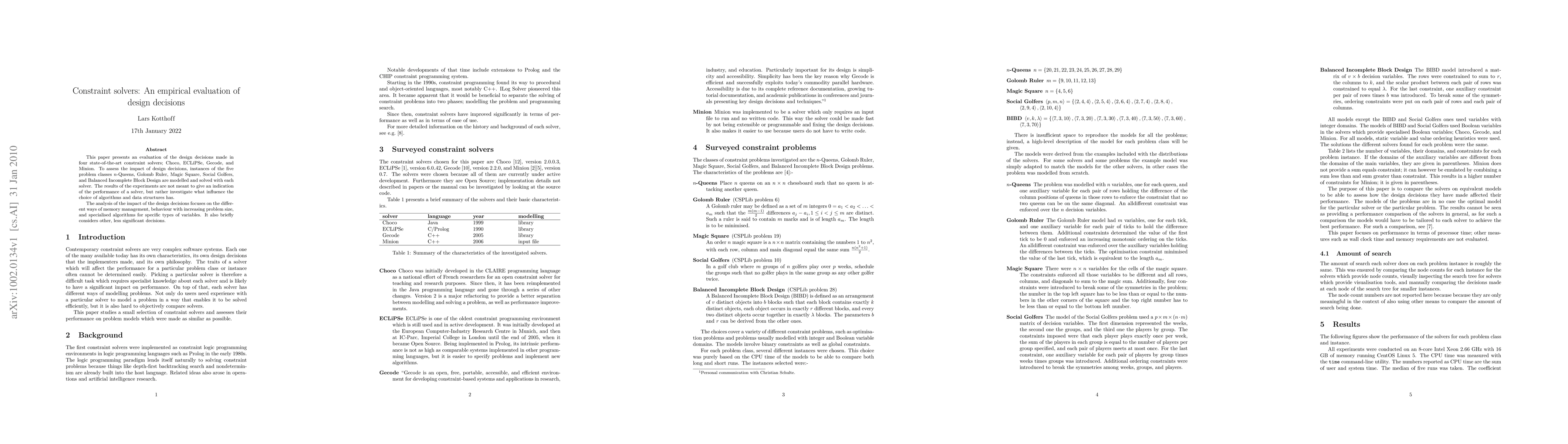 This paper evaluates the design decisions in four constraint solvers—Choco, ECLiPSe, Gecode, and Minion—by solving five problem classes. The study investigates how choices in algorithms, data structures, and memory management influence solver performance, rather than comparing overall solver efficiency.