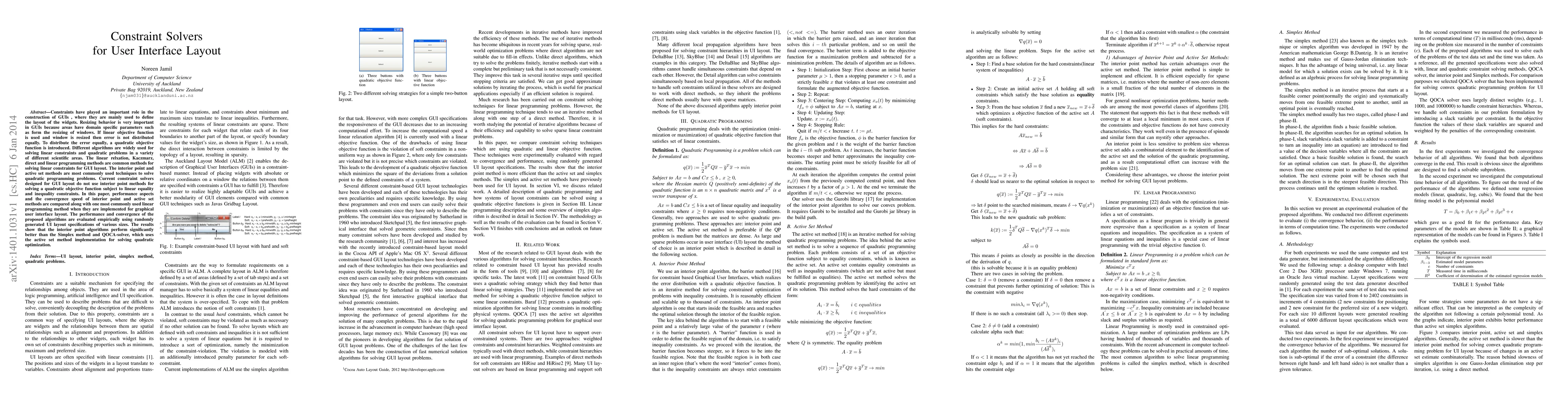 Researchers compared the performance of interior point methods, active set methods, and linear programming for solving quadratic optimization problems in GUI layout, finding that interior point algorithms outperformed others.