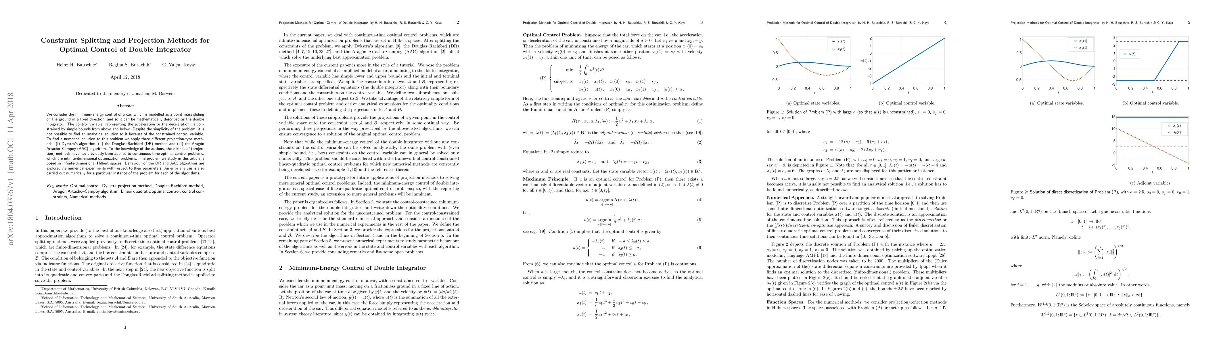We consider the minimum-energy control of a car, which is modelled as a point mass sliding on the ground in a fixed direction, and so it can be mathematically described as the double integrator. The control variable, representing the acceleration or the deceleration, is constrained by simple bounds from above and below. Despite the simplicity of the problem, it is not possible to find an analytical solution to it because of the constrained control variable. To find a numerical solution to this problem we apply three different projection-type methods: (i)~Dykstra's algorithm, (ii)~the Douglas--Rachford (DR) method and (iii)~the Arag\'on Artacho--Campoy (AAC) algorithm. To the knowledge of the authors, these kinds of (projection) methods have not previously been applied to continuous-time optimal control problems, which are infinite-dimensional optimization problems. The problem we study in this article is posed in infinite-dimensional Hilbert spaces. Behaviour of the DR and AAC algorithms are explored via numerical experiments with respect to their parameters. An error analysis is also carried out numerically for a particular instance of the problem for each of the algorithms.