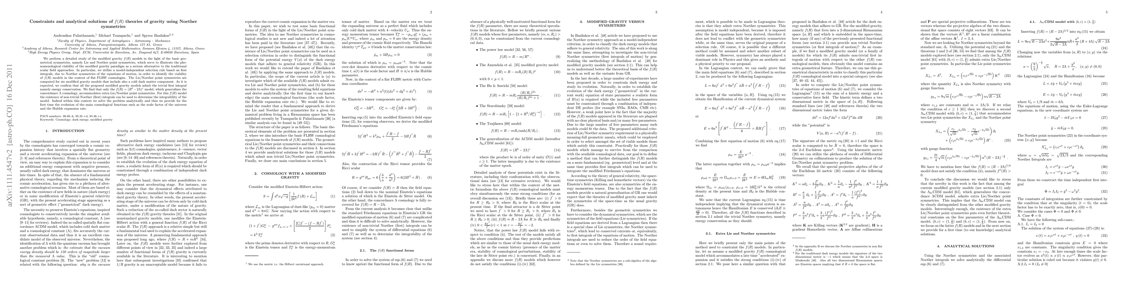 We perform a detailed study of the modified gravity $f(R)$ models in the light of the basic geometrical symmetries, namely Lie and Noether point symmetries, which serve to illustrate the phenomenological viability of the modified gravity paradigm as a serious alternative to the traditional scalar field approaches. In particular, we utilize a model-independent selection rule based on first integrals, due to Noether symmetries of the equations of motion, in order to identify the viability of $f(R)$ models in the context of flat FLRW cosmologies. The Lie/Noether point symmetries are computed for six modified gravity models that include also a cold dark matter component. As it is expected, we confirm that all the proposed modified gravity models admit the trivial first integral namely energy conservation. We find that only the $f(R)=(R^{b}-2\Lambda)^{c}$ model, which generalizes the concordance $\Lambda$ cosmology, accommodates extra Lie/Noether point symmetries. For this $f(R)$ model the existence of non-trivial Noether (first) integrals can be used to determine the integrability of the model. Indeed within this context we solve the problem analytically and thus we provide for the first time the evolution of the main cosmological functions such as the scale factor of the universe and the Hubble expansion rate.