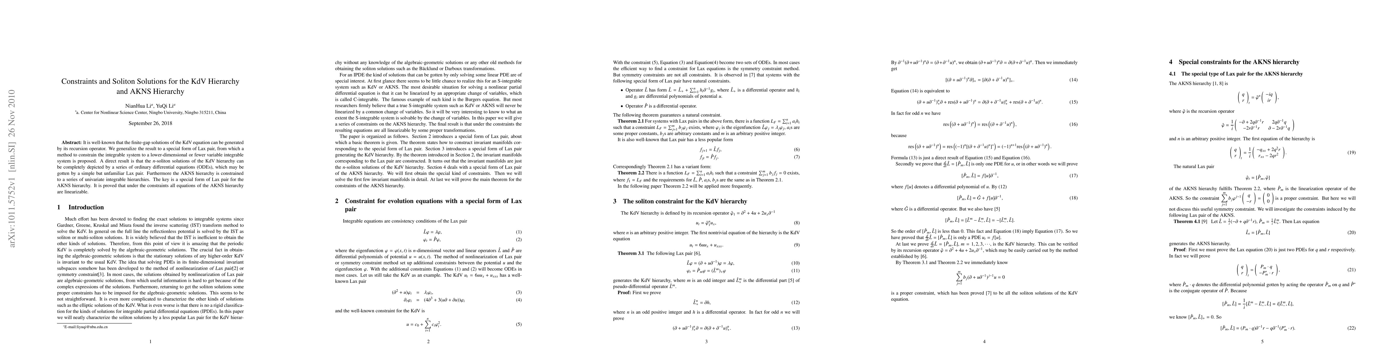 This research generalizes the generation of finite-gap solutions for the KdV equation via a recursion operator and proposes a method to constrain the KdV and AKNS hierarchies to lower-dimensional systems. It demonstrates that $n$-soliton solutions of the KdV hierarchy can be expressed through ordinary differential equations using a special Lax pair, and shows that the AKNS hierarchy under constraints can be linearized.