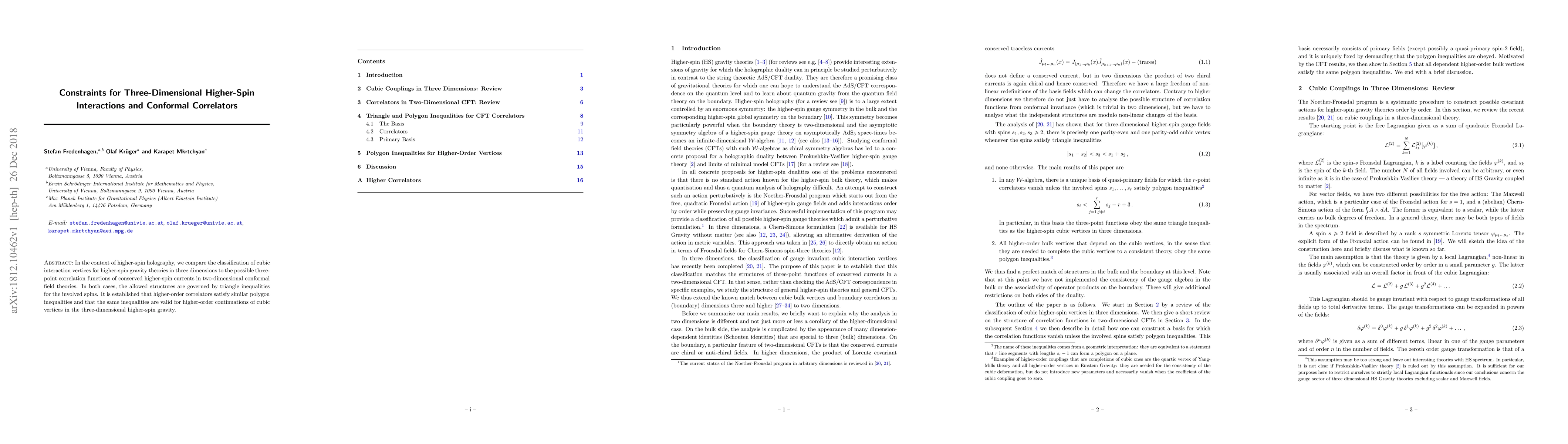 This paper investigates the constraints on three-dimensional higher-spin gravity interactions and their correspondence to two-dimensional conformal field theories, revealing that both are governed by triangle inequalities for involved spins. It establishes that higher-order correlators and cubic vertices follow similar polygon inequalities.