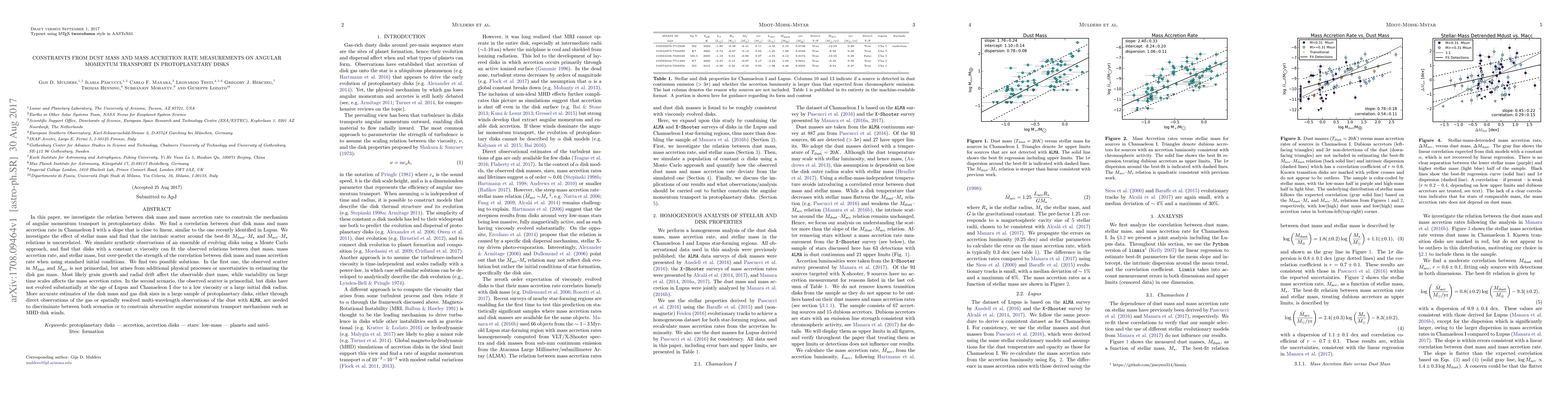 This paper examines the correlation between dust mass and mass accretion rate in protoplanetary disks to infer angular momentum transport mechanisms. It finds that while constant alpha viscosity models can fit observed relations, they over-predict the correlation strength, suggesting either additional physical processes or primordial scatter due to low viscosity or large initial disk radii. Further observations are needed to resolve these possibilities.