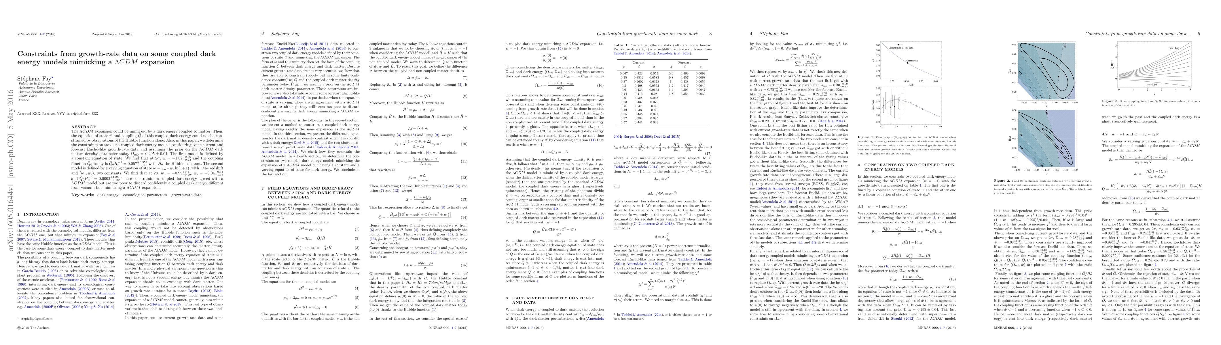 The $\Lambda CDM$ expansion could be mimicked by a dark energy coupled to matter. Then, the equation of state $\bar w$ and coupling $\bar Q$ of this coupled dark energy could not be constrained by observations of the Hubble function alone. Also, in this paper, we determine the constraints on two such coupled dark energy models considering some current and forecast Euclid-like growth-rate data and assuming the prior on the $\Lambda CDM$ dark matter density parameter today $\Omega_{m0}=0.295\pm 0.04$. The first model is defined by a constant equation of state. We find that at $2\sigma$, $\bar w=-1.02_{-0.22}^{+0.06}$ and the coupling function $\bar Q_0$ today is $\bar Q_0H_0^{-3}=0.057_{-0.148}^{+0.353}$ with $H_0$ the Hubble constant. The second model is defined by a varying equation of state $\bar w=\bar w_a-\bar w_b\ln(1+z)$, with $z$ the redshift and $(\bar w_a,\bar w_b)$, two constants. We find that at $2\sigma$, $\bar w_a=-0.99_{-0.90}^{+0.17}$, $\bar w_b=-0.04_{-1.17}^{+0.31}$ and $\bar Q_0H_0^{-3}=0.0002_{-0.18}^{+1.35}$. These constraints on coupled dark energy agreed with a $\Lambda CDM$ model but are too poor to discard confidently a coupled dark energy different from vacuum but mimicking a $\Lambda CDM$ expansion.