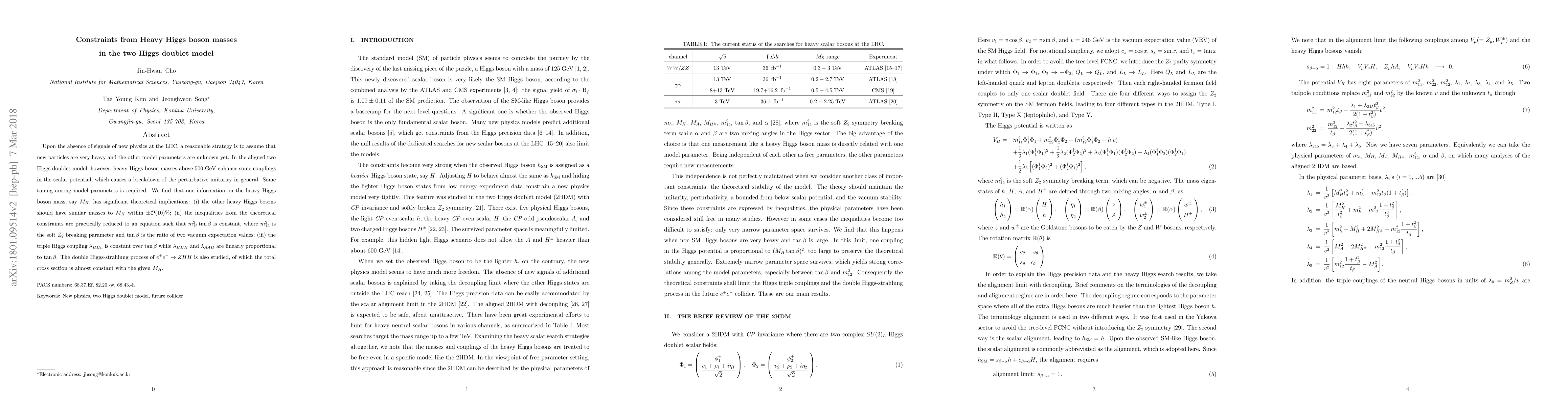 Upon the absence of signals of new physics at the LHC, a reasonable strategy is to assume that new particles are very heavy and the other model parameters are unknown yet. In the aligned two Higgs doublet model, however, heavy Higgs boson masses above 500 GeV enhance some couplings in the scalar potential, which causes a breakdown of the perturbative unitariry in general. Some tuning among model parameters is required. We find that one information on the heavy Higgs boson mass, say $M_H$, has significant theoretical implications: (i) the other heavy Higgs bosons should have similar masses to $M_H$ within $\pm \mathcal{O}(10)\%$; (ii) the inequalities from the theoretical constraints are practically reduced to an equation such that $m_{12}^2 \tan\beta$ is constant, where $m_{12}^2$ is the soft $Z_2$ breaking parameter and $\tan\beta$ is the ratio of two vacuum expectation values; (iii) the triple Higgs coupling $\lambda_{HHh}$ is constant over $\tan\beta$ while $\lambda_{HHH}$ and $\lambda_{AAH}$ are linearly proportional to $\tan\beta$. The double Higgs-strahlung process of $e^+ e^- \to ZHH$ is also studied, of which the total cross section is almost constant with the given $M_H$.