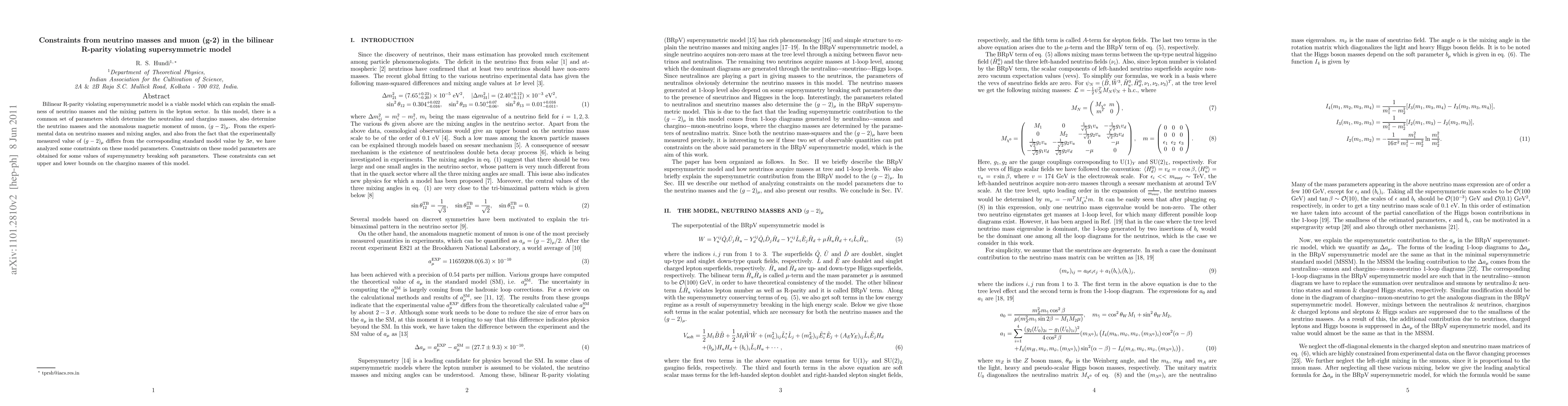 This paper investigates the bilinear R-parity violating supersymmetric model, which explains small neutrino masses and lepton mixing patterns. It analyzes constraints on model parameters derived from neutrino mass data and the anomalous magnetic moment of the muon, setting bounds on chargino masses.