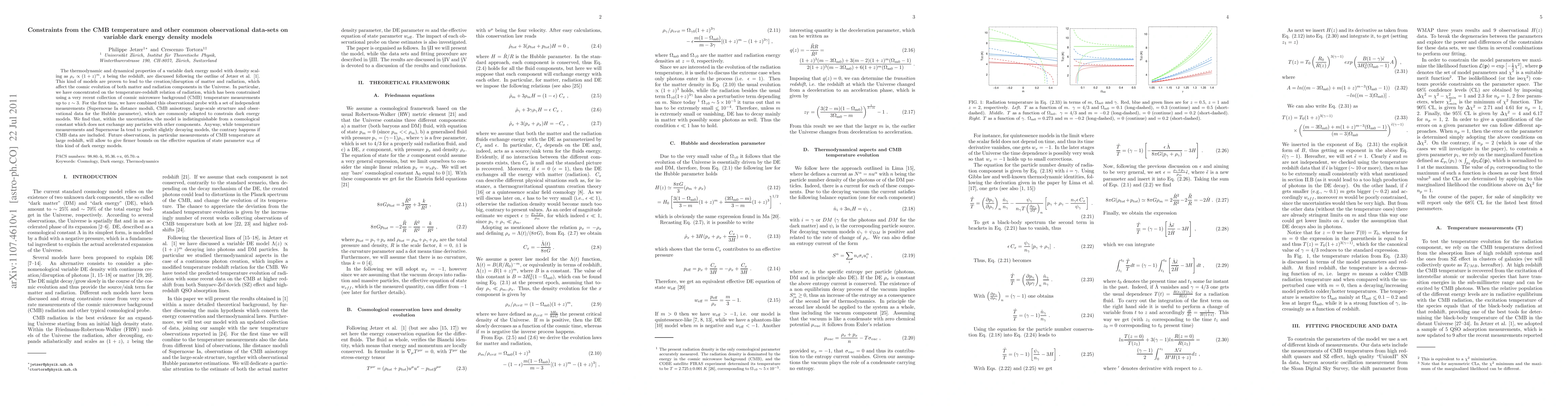 The thermodynamic and dynamical properties of a variable dark energy model with density scaling as rho_x \propto (1+z)^m, z being the redshift, are discussed following the outline of Jetzer et al. This kind of models are proven to lead to the creation/disruption of matter and radiation, which affect the cosmic evolution of both matter and radiation components in the Universe. In particular, we have concentrated on the temperature-redshift relation of radiation, which has been constrained using a very recent collection of cosmic microwave background (CMB) temperature measurements up to z ~ 3. For the first time, we have combined this observational probe with a set of independent measurements (Supernovae Ia distance moduli, CMB anisotropy, large-scale structure and observational data for the Hubble parameter), which are commonly adopted to constrain dark energy models. We find that, within the uncertainties, the model is indistinguishable from a cosmological constant which does not exchange any particles with other components. Anyway, while temperature measurements and Supernovae Ia tend to predict slightly decaying models, the contrary happens if CMB data are included. Future observations, in particular measurements of CMB temperature at large redshift, will allow to give firmer bounds on the effective equation of state parameter w_eff of this kind of dark energy models.