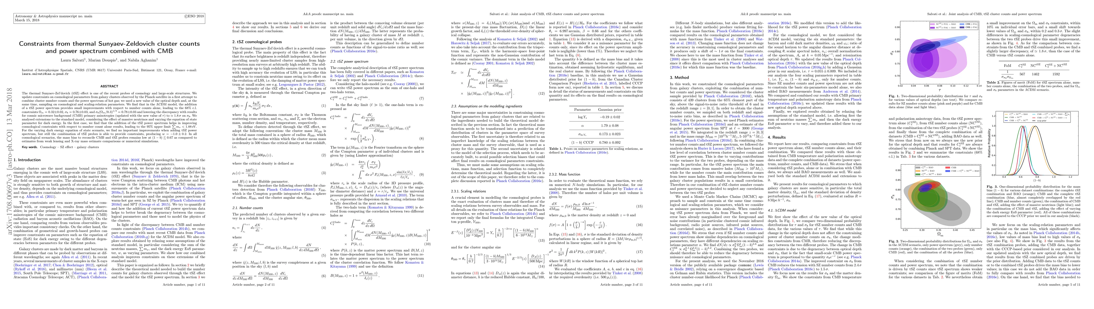 Thermal Sunyaev-Zel'dovich effect is one of the recent probes of cosmology and large scale structures. We update constraints on cosmological parameters from galaxy clusters observed by the Planck satellite in a first attempt to combine cluster number counts and power spectrum of hot gas, using the new value of the optical depth, and sampling at the same time on cosmological and scaling-relation parameters. We find that in the $\Lambda$CDM model, the addition of tSZ power spectrum provides only small improvements with respect to number counts only, leading to the $68\%$ c.l. constraints $\Omega_m = 0.32 \pm 0.02$, $\sigma_8 = 0.77\pm0.03 $ and $\sigma_8 (\Omega_m/0.3)^{1/3}= 0.78\pm0.03$ and lowering the discrepancy with CMB primary anisotropies results (updated with the new value of $\tau$) to $\simeq 1.6\, \sigma$ on $\sigma_8$. We analyse extensions to standard model, considering the effect of massive neutrinos and varying the equation of state parameter for dark energy. In the first case, we find that the addition of tSZ power spectrum helps in strongly improving cosmological constraints with respect to number counts only results, leading to the $95\%$ upper limit $\sum m_{\nu}< 1.53 \, \text{eV}$. For the varying dark energy EoS scenario, we find again no important improvements when adding tSZ power spectrum, but still the combination of tSZ probes is able in providing constraints, producing $w = -1.0\pm 0.2$. In all cosmological scenari the mass bias to reconcile CMB and tSZ probes remains low: $(1-b)\lesssim 0.66$ as compared to estimates from weak lensing and Xray mass estimate comparisons or numerical simulations.