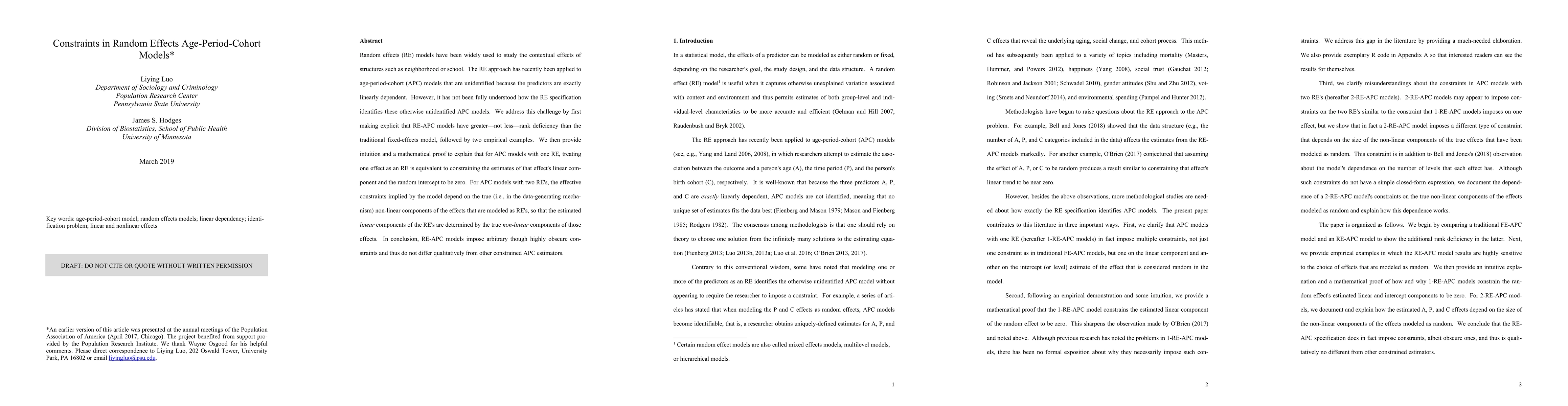 Random effects (RE) models have been widely used to study the contextual effects of structures such as neighborhood or school. The RE approach has recently been applied to age-period-cohort (APC) models that are unidentified because the predictors are exactly linearly dependent. However, it has not been fully understood how the RE specification identifies these otherwise unidentified APC models. We address this challenge by first making explicit that RE-APC models have greater -- not less -- rank deficiency than the traditional fixed-effects model, followed by two empirical examples. We then provide intuition and a mathematical proof to explain that for APC models with one RE, treating one effect as an RE is equivalent to constraining the estimates of that effect's linear component and the random intercept to be zero. For APC models with two RE's, the effective constraints implied by the model depend on the true (i.e., in the data-generating mechanism) non-linear components of the effects that are modeled as RE's, so that the estimated linear components of the RE's are determined by the true non-linear components of those effects. In conclusion, RE-APC models impose arbitrary though highly obscure constraints and thus do not differ qualitatively from other constrained APC estimators.