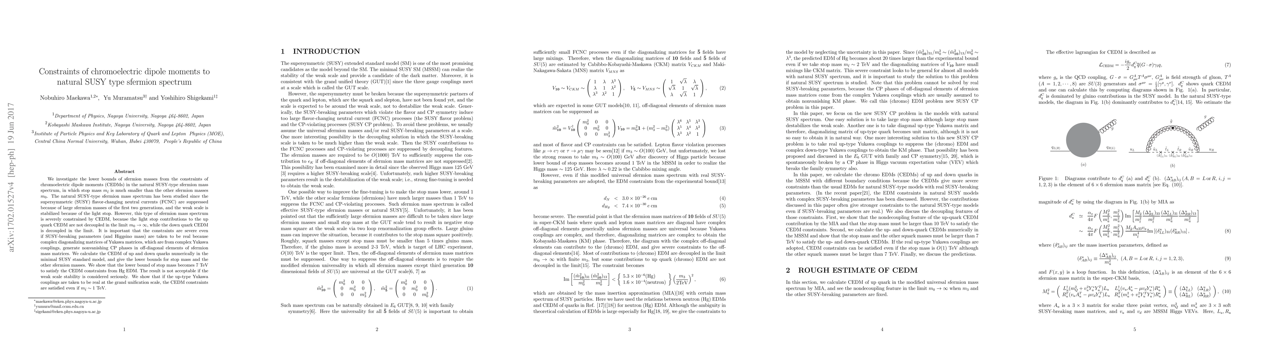 We investigate the lower bounds of sfermion masses from the constraints of chromoelectric dipole moments (CEDMs) in the natural SUSY-type sfermion mass spectrum, in which stop mass $m_{\tilde t}$ is much smaller than the other sfermion masses $m_0$. The natural SUSY-type sfermion mass spectrum has been studied since the supersymmetric (SUSY) flavor-changing neutral currents (FCNC) are suppressed because of large sfermion masses of the first two generations, and the weak scale is stabilized because of the light stop. However, this type of sfermion mass spectrum is severely constrained by CEDM, because the light stop contributions to the up quark CEDM are not decoupled in the limit $m_0\rightarrow\infty$, while the down quark CEDM is decoupled in the limit. It is important that the constraints are severe even if SUSY-breaking parameters (and Higgsino mass) are taken to be real because complex diagonalizing matrices of Yukawa matrices, which are from complex Yukawa couplings, generate nonvanishing CP phases in off-diagonal elements of sfermion mass matrices. We calculate the CEDM of up and down quarks numerically in the minimal SUSY standard model, and give the lower bounds for stop mass and the other sfermion masses. We show that the lower bound of stop mass becomes 7 TeV to satisfy the CEDM constraints from Hg EDM. The result is not acceptable if the weak scale stability is considered seriously. We show that if the up-type Yukawa couplings are taken to be real at the grand unification scale, the CEDM constraints are satisfied even if $m_{\tilde t}\sim 1$ TeV.