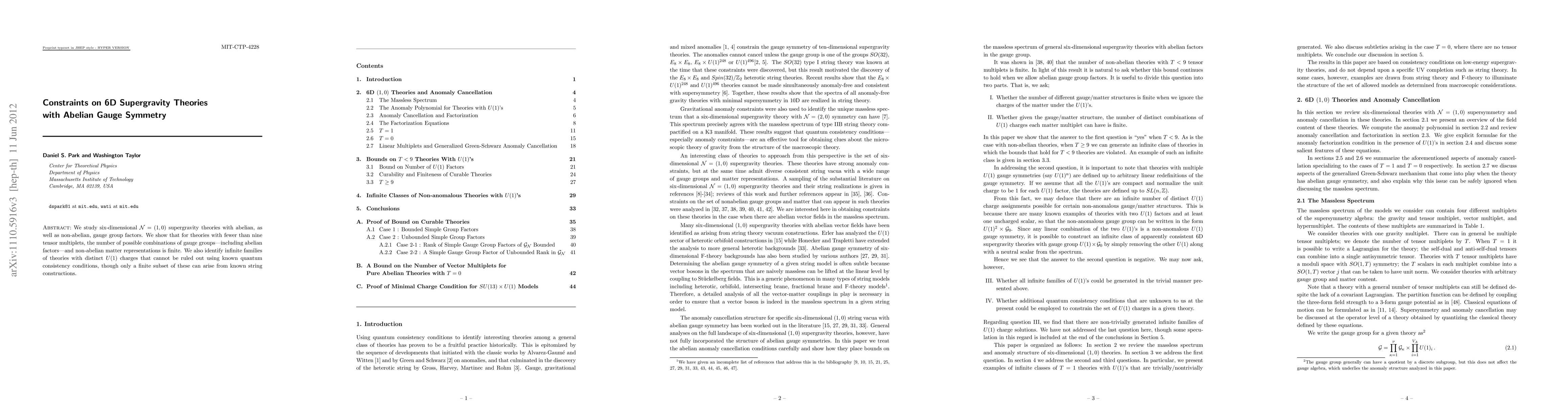 This paper investigates six-dimensional N=(1,0) supergravity theories with abelian and non-abelian gauge groups, finding that theories with fewer than nine tensor multiplets have a finite number of possible gauge group combinations. It identifies infinite families of viable theories with distinct U(1) charges, though only a subset can be derived from known string constructions.