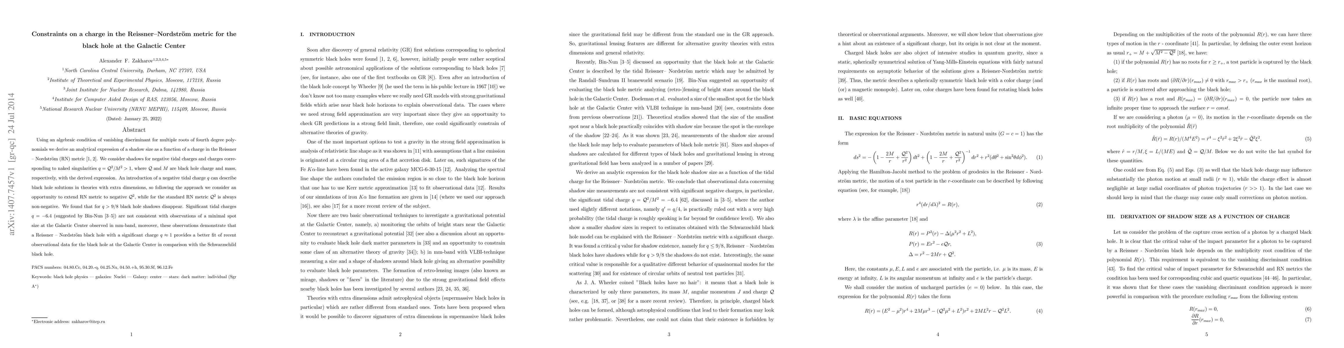 Using an algebraic condition of vanishing discriminant for multiple roots of fourth degree polynomials we derive an analytical expression of a shadow size as a function of a charge in the Reissner -- Nordstr\"om (RN) metric \cite{Reissner_16,Nordstrom_18}. We consider shadows for negative tidal charges and charges corresponding to naked singularities $q=\mathcal{Q}^2/M^2 > 1$, where $\mathcal{Q}$ and $M$ are black hole charge and mass, respectively, with the derived expression. An introduction of a negative tidal charge $q$ can describe black hole solutions in theories with extra dimensions, so following the approach we consider an opportunity to extend RN metric to negative $\mathcal{Q}^2$, while for the standard RN metric $\mathcal{Q}^2$ is always non-negative. We found that for $q > 9/8$ black hole shadows disappear. Significant tidal charges $q=-6.4$ (suggested by Bin-Nun (2010)) are not consistent with observations of a minimal spot size at the Galactic Center observed in mm-band, moreover, these observations demonstrate that a Reissner -- Nordstr\"om black hole with a significant charge $q \approx 1$ provides a better fit of recent observational data for the black hole at the Galactic Center in comparison with the Schwarzschild black hole.