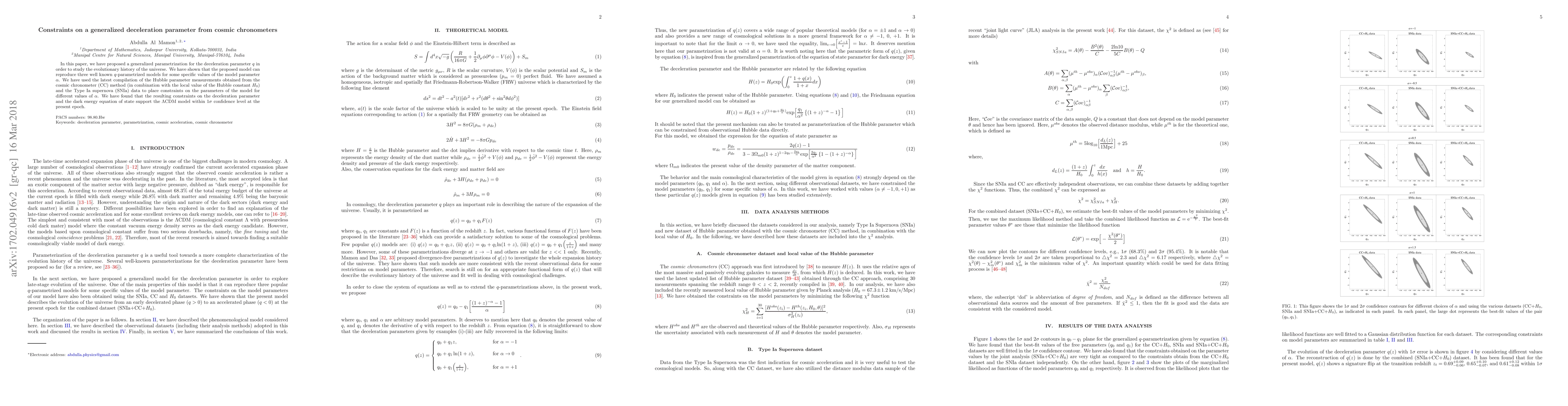 This paper proposes a generalized parametrization for the deceleration parameter $q$ to study the universe's evolution, showing it can reproduce three known $q$-parametrized models. Using cosmic chronometer data and Type Ia supernova data, it finds constraints supporting the $\Lambda$CDM model for the present epoch within $1\sigma$ confidence.